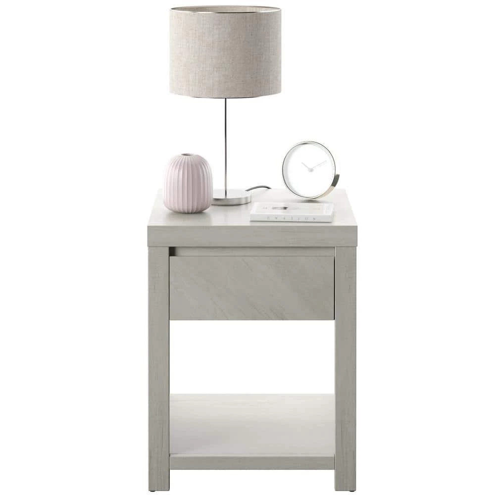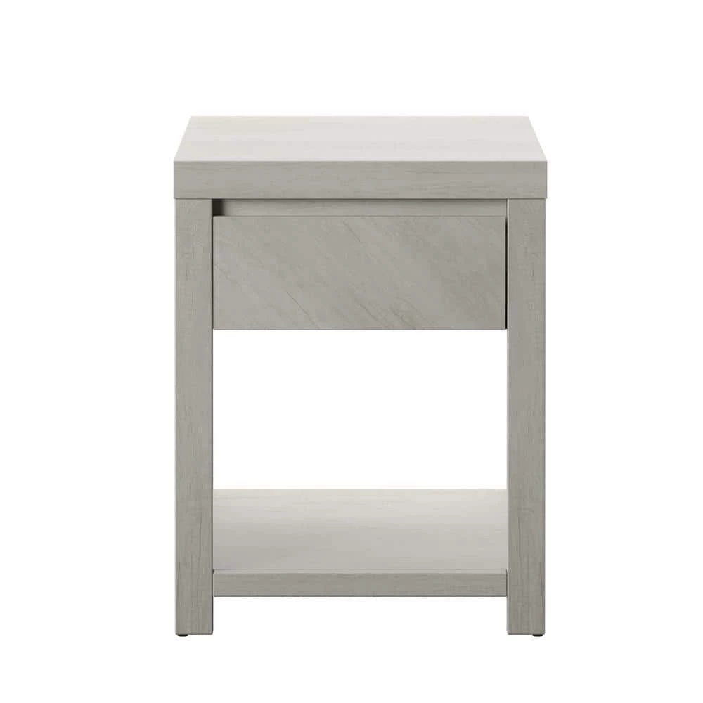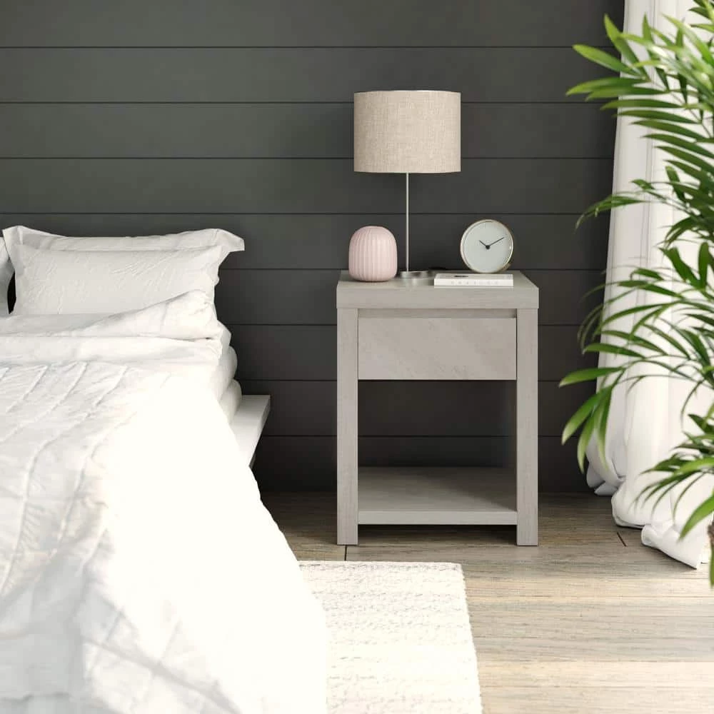 This modern one-drawer nightstand features an open lower storage area, a smooth-gliding drawer for concealed storage, and plenty of space on top to keep your nighttime essentials nearby. Its refined silhouette works well with any decor, and two built-in USB ports provide convenient, clutter-free charging capabilities for phones, earbuds, and tablets. Clean lines and modern angles provide a stylish, up-to-date look, while quality construction delivers lasting durability. Give your home a total makeover with a matching dresser, TV stand, and coffee table.