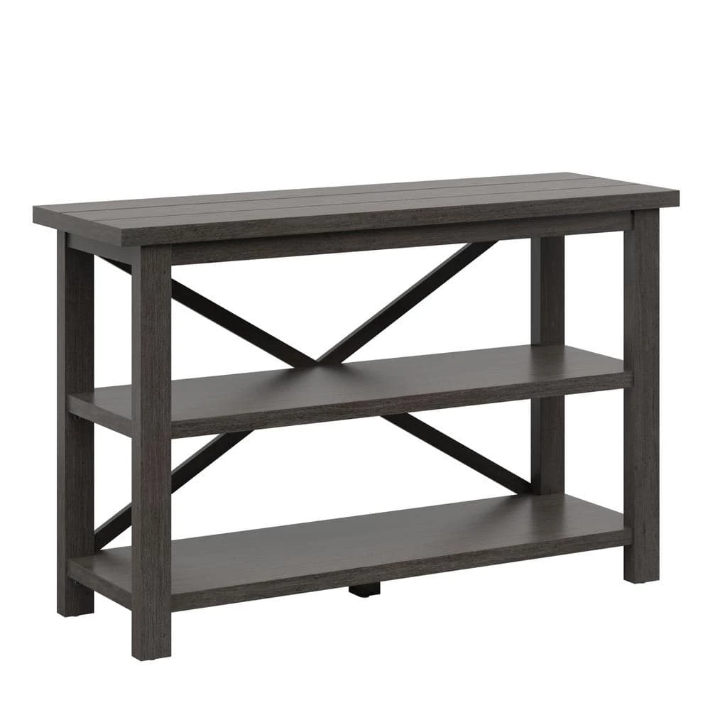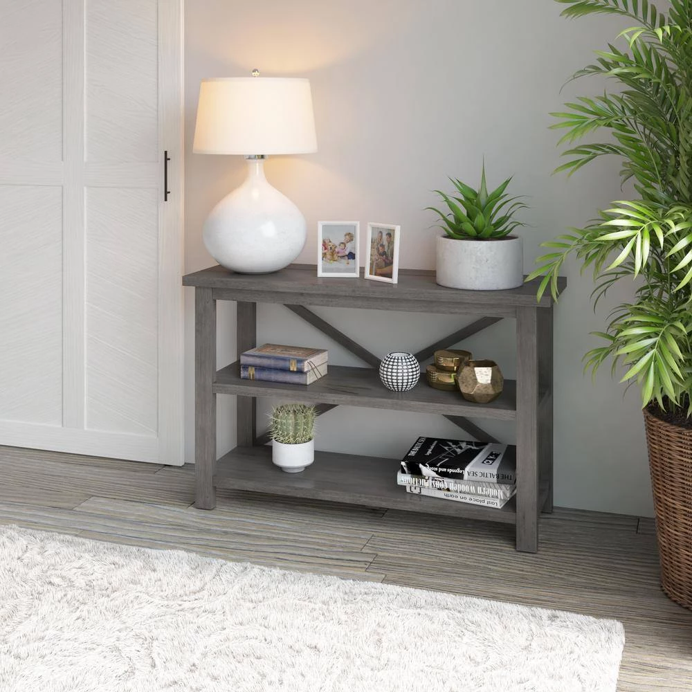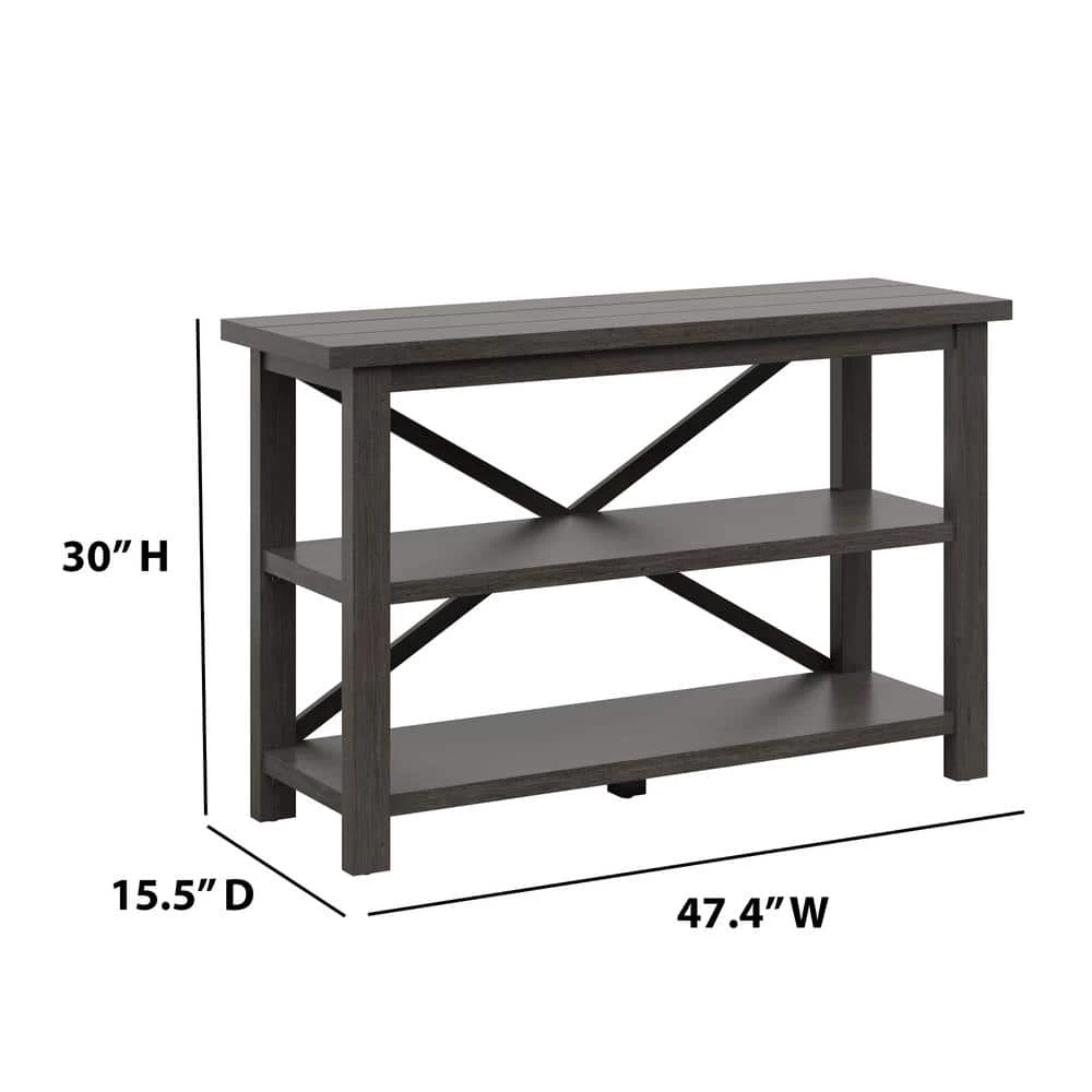 The storage possibilities and style opportunities are endless with this entryway table that can hold your phone and keys in your entryway, be used in your living room as a sofa back, or go in your dining room as a sideboard. This beautiful piece brings modern farmhouse charm and convenience to any space in your home. The two fixed, lower shelves provide plenty of space for shoes, bags, and anything else that gets dropped by the door. Alternatively, you can use the open shelving for a book or movie collection. If you already have all the storage you need, style these shelves with your favorite seasonal decor or family photos.
