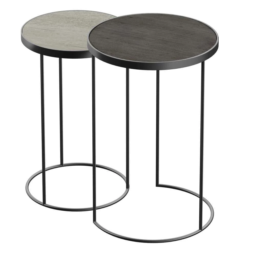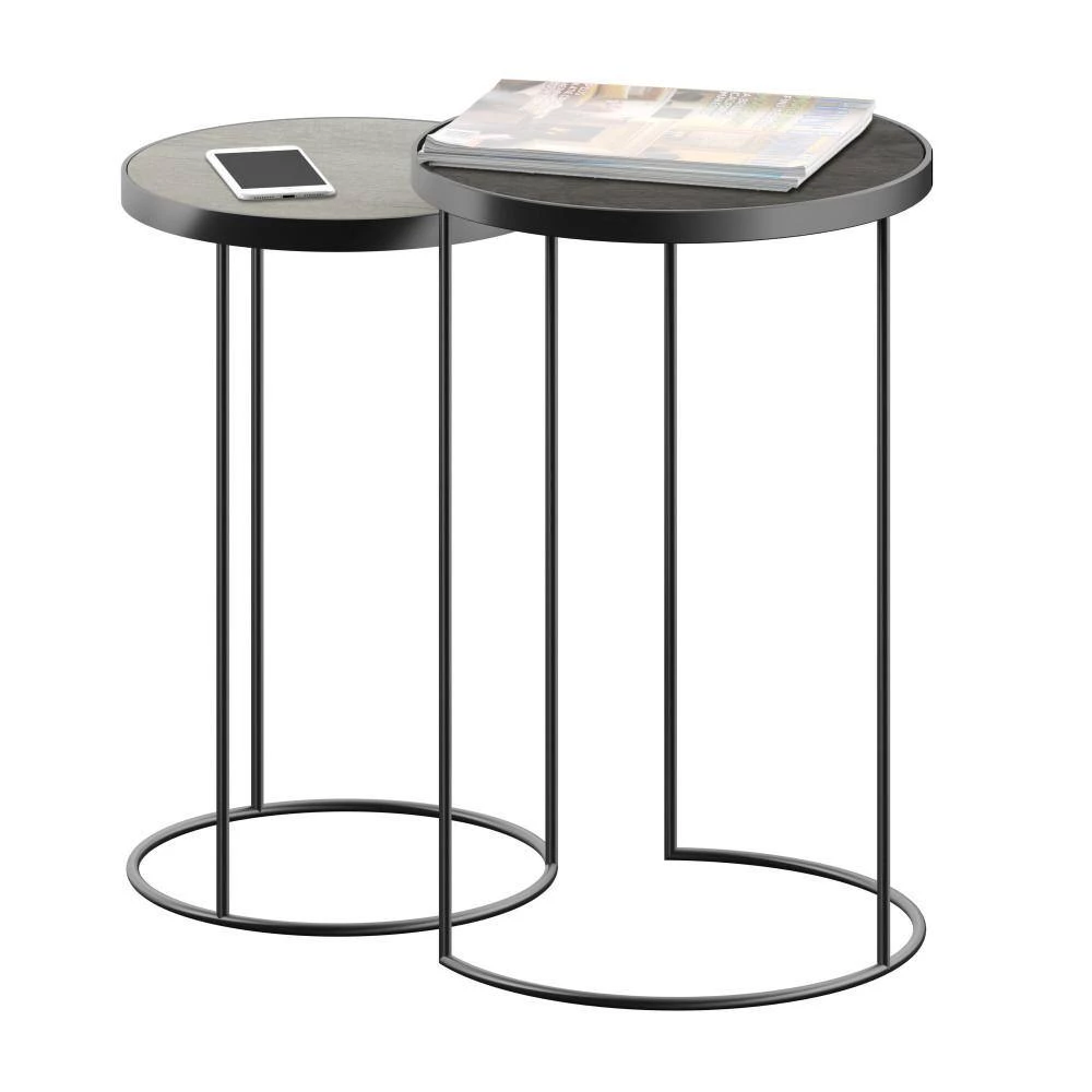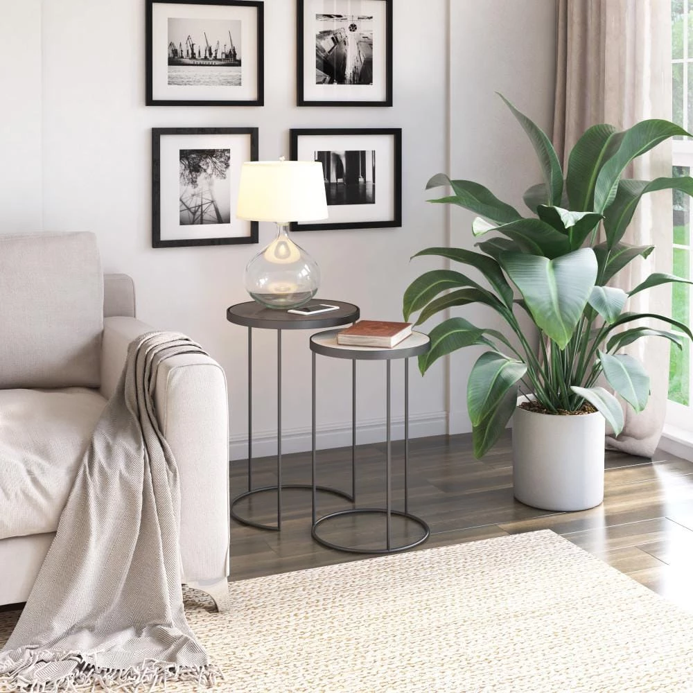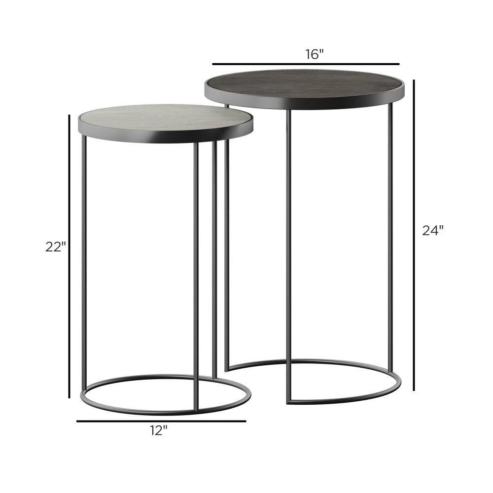This (set of 2) nesting tables offers contemporary style and a functional surface space for any room in your home. One table features a French inspired print top while the other features the look of a light stone finish. Pair them together in the same area to create contrasting visual interest or use them separately to double the benefits and have multiple surfaces for holding drinks, potted plants, and more.