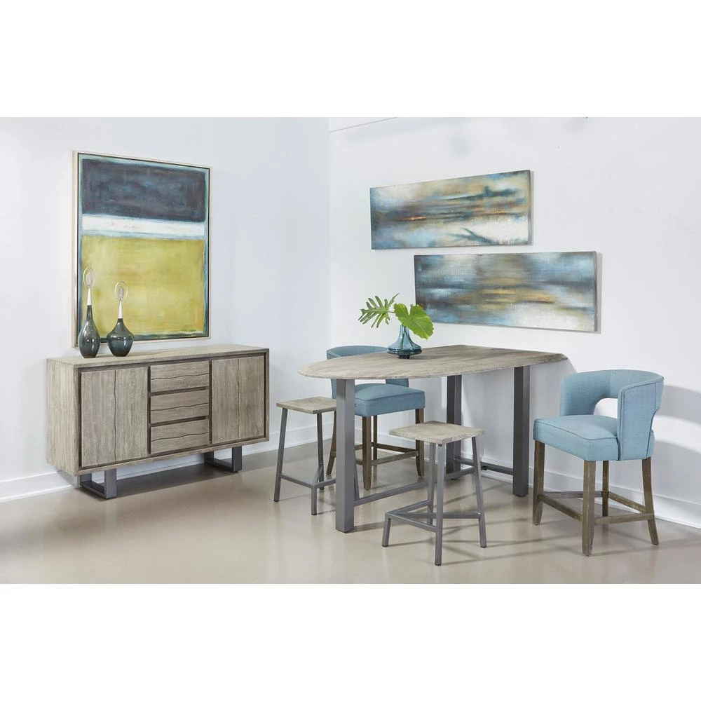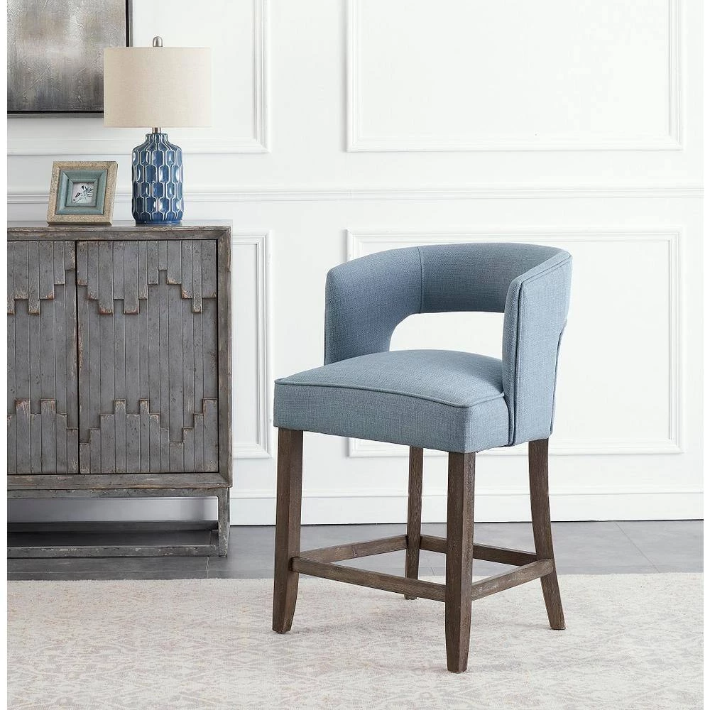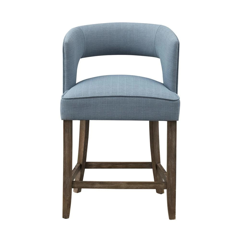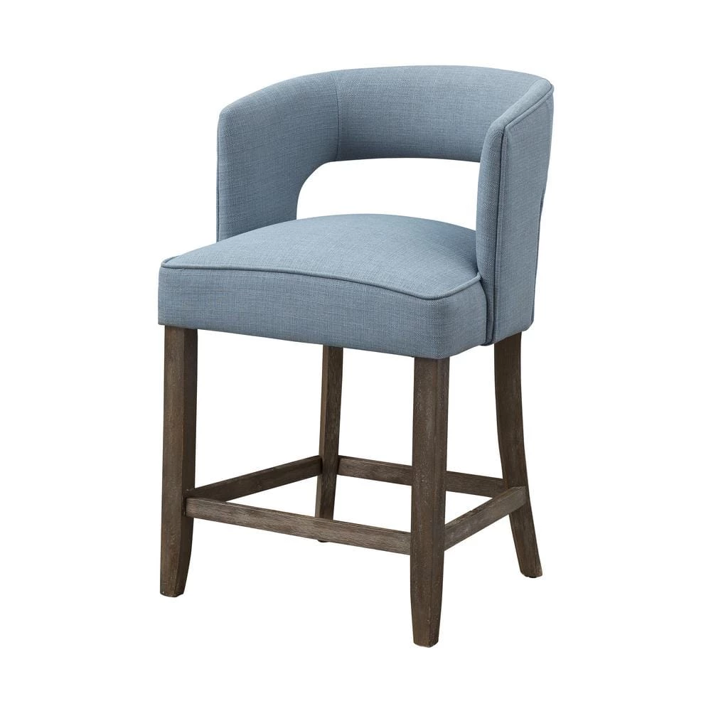 Perch at your kitchen bar or around that new counter height table in the game room in total comfort and style with these super comfortable and plush Counter Height Barstools. Upholstered in our Yukon Blue fabric, the thickly padded seat features a keyhole back that wraps around to cradle you as you sit and chat. Tall and slender wood tone legs are the perfect base, and with the wrap around supports giving added stability as well as a convenient place to rest your feet, you may find that you spend more and more time at the bar.