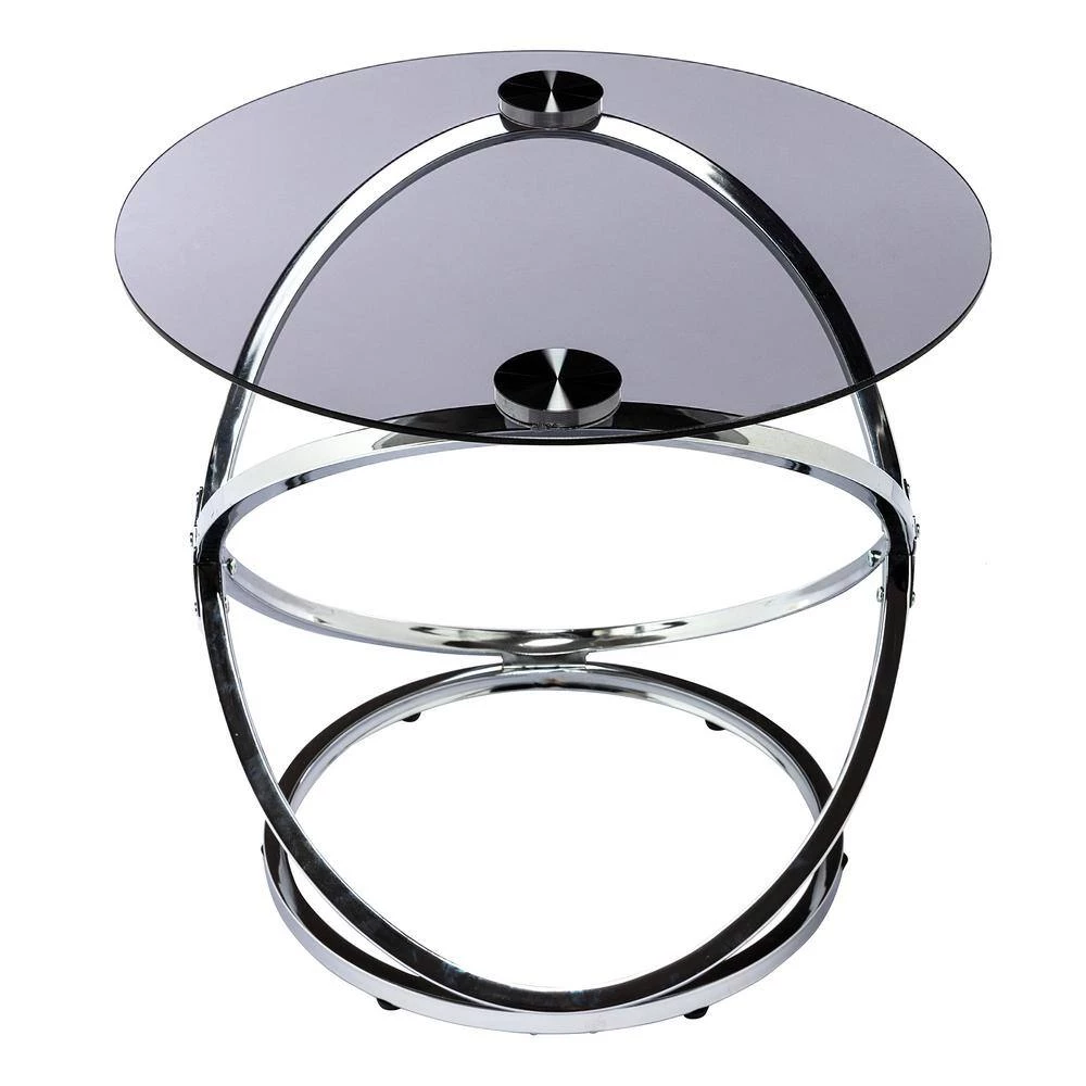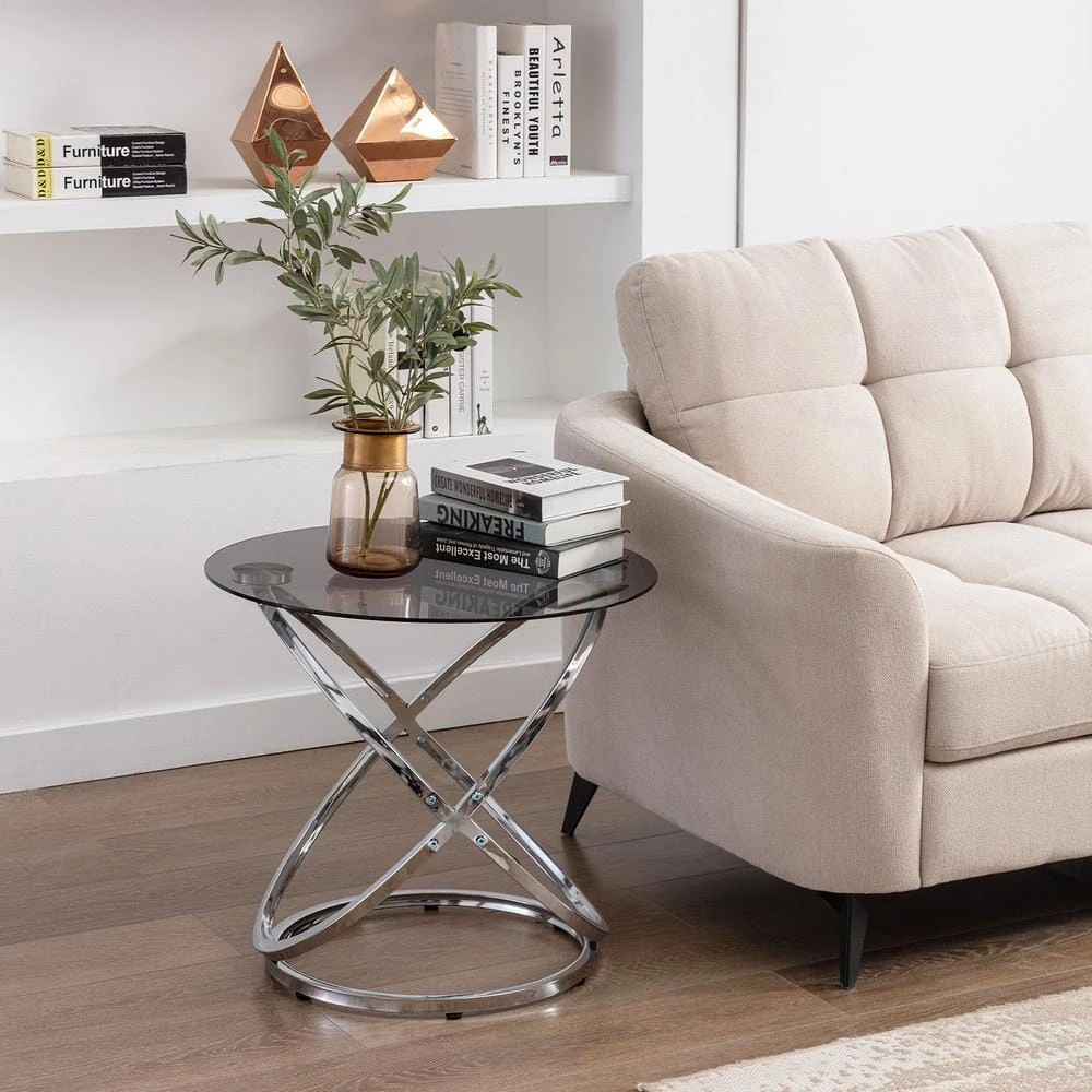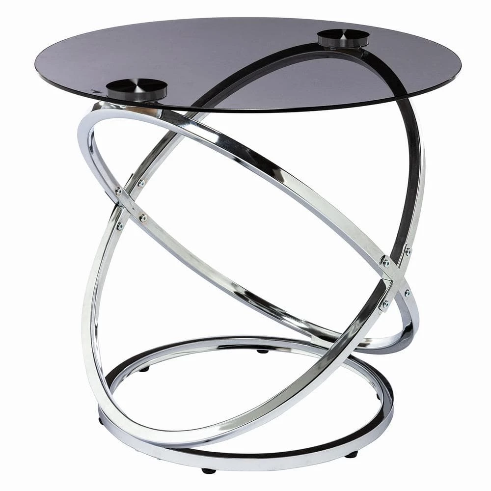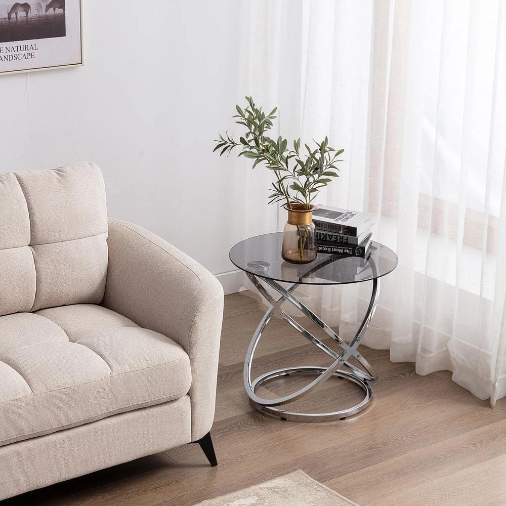 Our side table is the perfect place for holding your favorite plant arrangement or a tray of snacks, featuring a wonderfully sleek gray tempered glass top. This selection is supported by an artistic interlocking circular frame and complemented with a dazzling chrome finish, providing your living room with a modern atmosphere. This side table is completed with stunning curves and brings a clean and stylish feel to any home.MODERN: Our side table offers an artistic structure topped with a gray tempered glass top for a modern touch to home. This end table will instantly give your decor a chic atmosphere, featuring an interlocking circular design and a stunning chrome color.TEMPERED GLASS: This table features a tempered glass top with a gorgeous gray translucent look. This glass is stronger and safer than regular glass, making this more resistant to breakage and shattering.IRON FRAME: Constructed of iron, the frame of this table is made to be incredibly durable, ensuring that this piece will hold up underuse. Refined with a stunning chrome finish, this unique interlocking circular frame brings an elegant touch to this piece, making it an understated yet chic addition to your home.DIMENSIONS: Choose an accessory that is the perfect size for you and your furniture.ASSEMBLY REQUIRED: Some assembly is required for this side table. All of the instructions and tools needed for assembly are included.