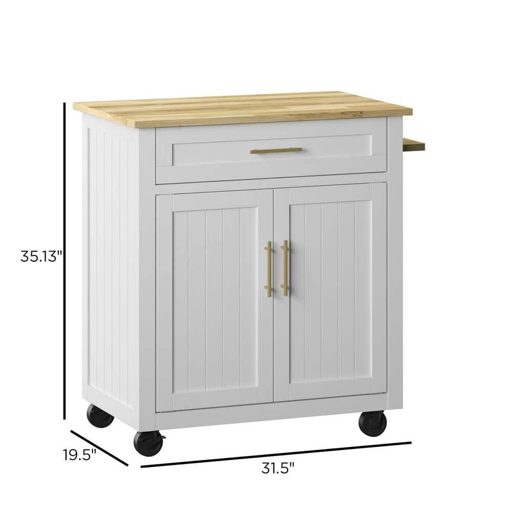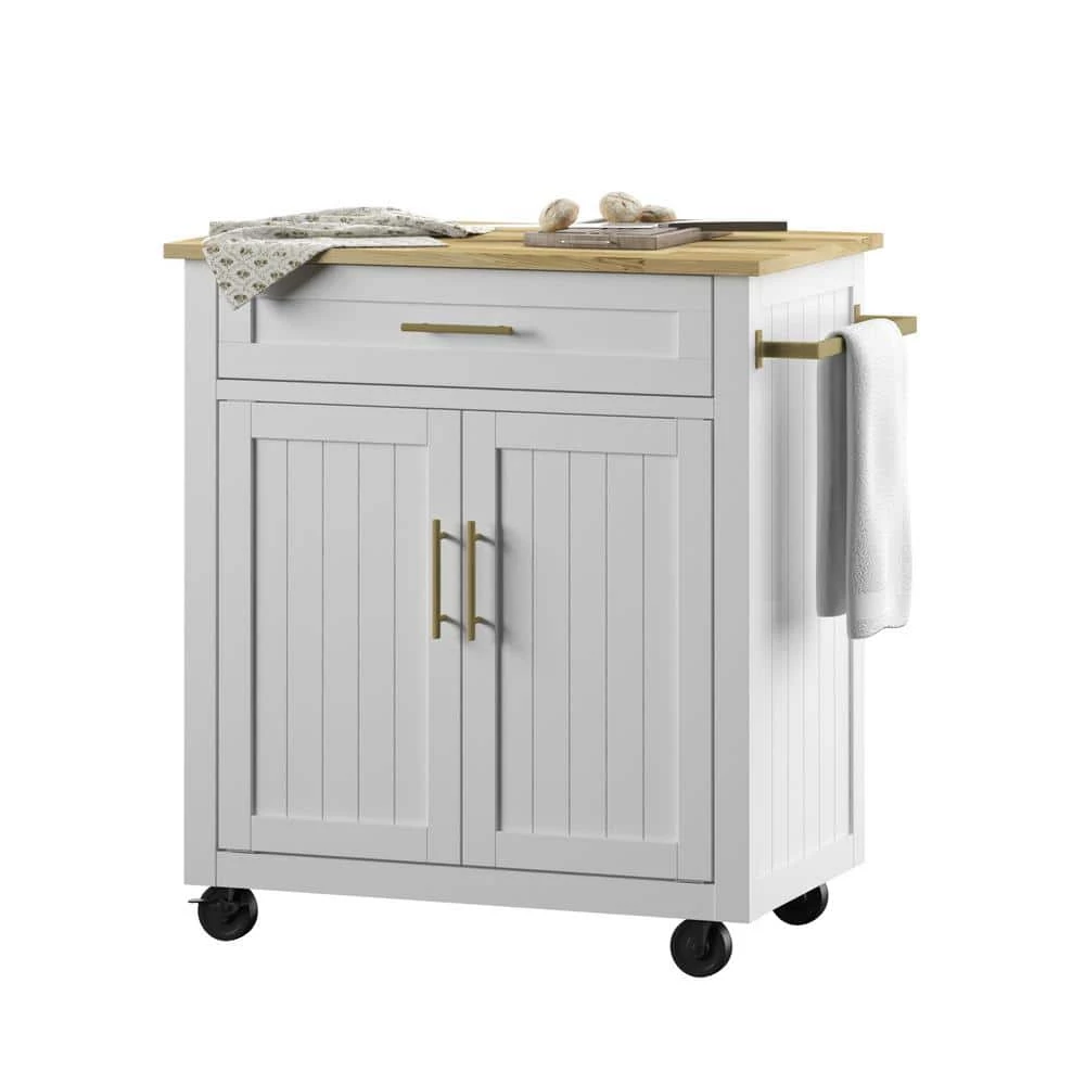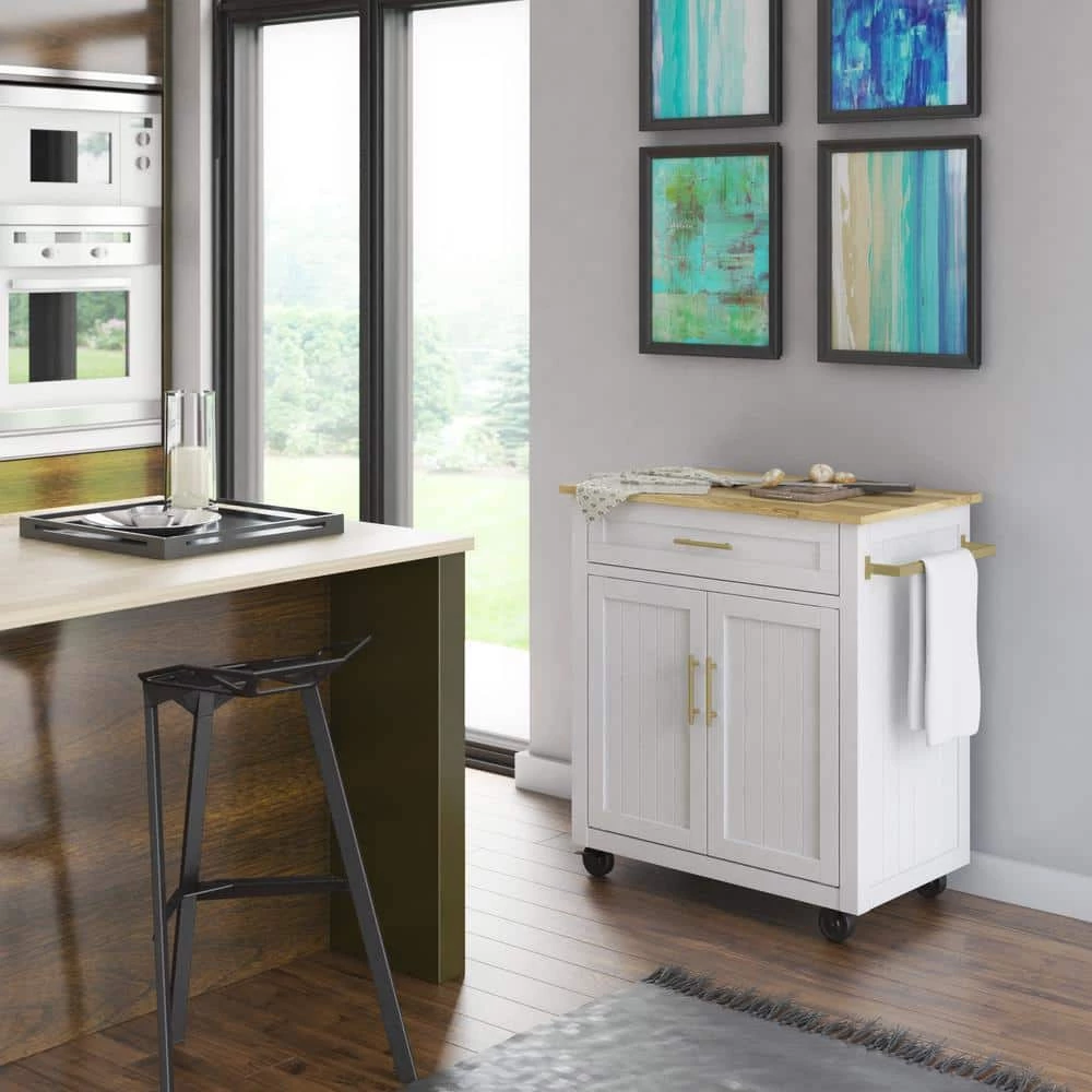 This rolling kitchen cart offers more workspace and storage to even the most compact kitchens. The upper drawer and lower cabinet provide plenty of storage for everything from cooking tools and spices to small appliances. The attached towel rack keeps you prepared for any spills that may happen along the way, and also serves as a handle to help you wheel out coffee and dessert to the dining room when hosting. The base of the kitchen cart has four wheels with locking swivel casters for easy mobility when you need it and secure placement when you don’t. Prep, mix, and plate your favorite dishes without the worry of the cart slipping away from you.