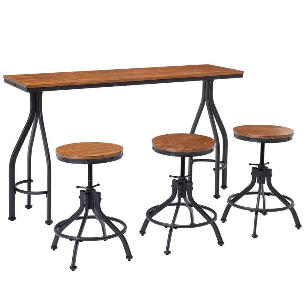 Urban Style Dining Table Set: With a rustic brown wood seat alongside with black metal base, this sleek and simple dining table set gives an urban feel to your house, fitting perfectly in your kitchen or breakfast nook. The decorative metal rivets make this dining set more stylish. Small Space Saving Design: The whole set includes 1 sleek dining table and 3 dining bar stools. Table measures 60 in. W x 17.7 in. D x 35.6 in. H and Stool measures 14.17 in. W x 14.17 in. D x 18.11 in. 24.8 in. H (he stool height can be adjustable). To save space, stools can be put under the table when you are not using them. Sturdy and Durable: Made of heavy metal, and thick engineered wood, the quality of this dining set can be trusted. Stools are designed with adjustable height with a swivel function and round footrests. Easy to Assembly: With a very clear installation instruction and necessary numbered hardware provided, it is very easy to set up. Customer Service: We will provide friendly customer service at any time. If you have any questions, we will be always there for you.