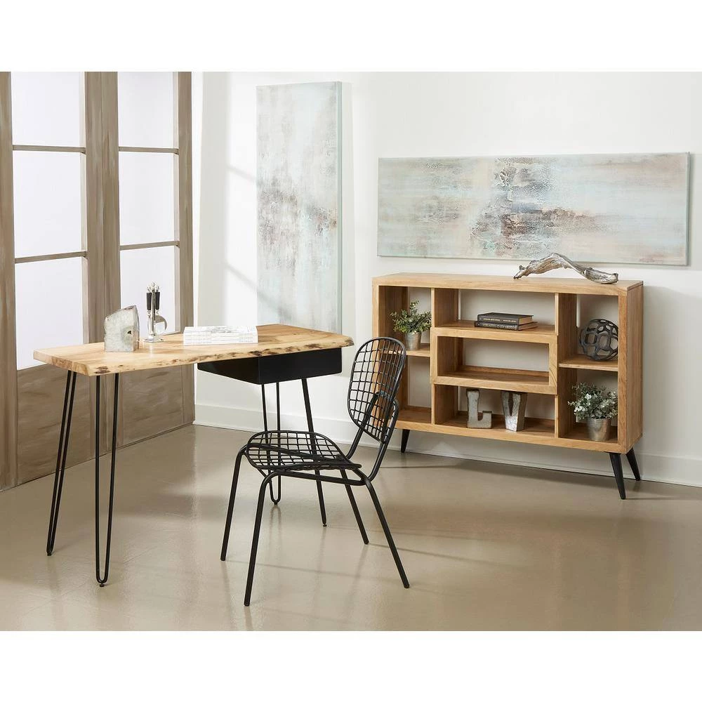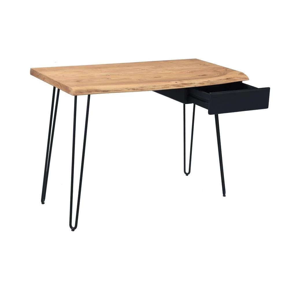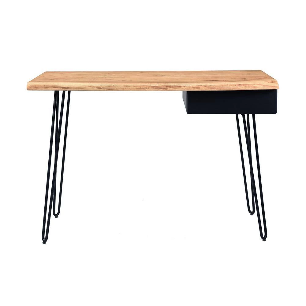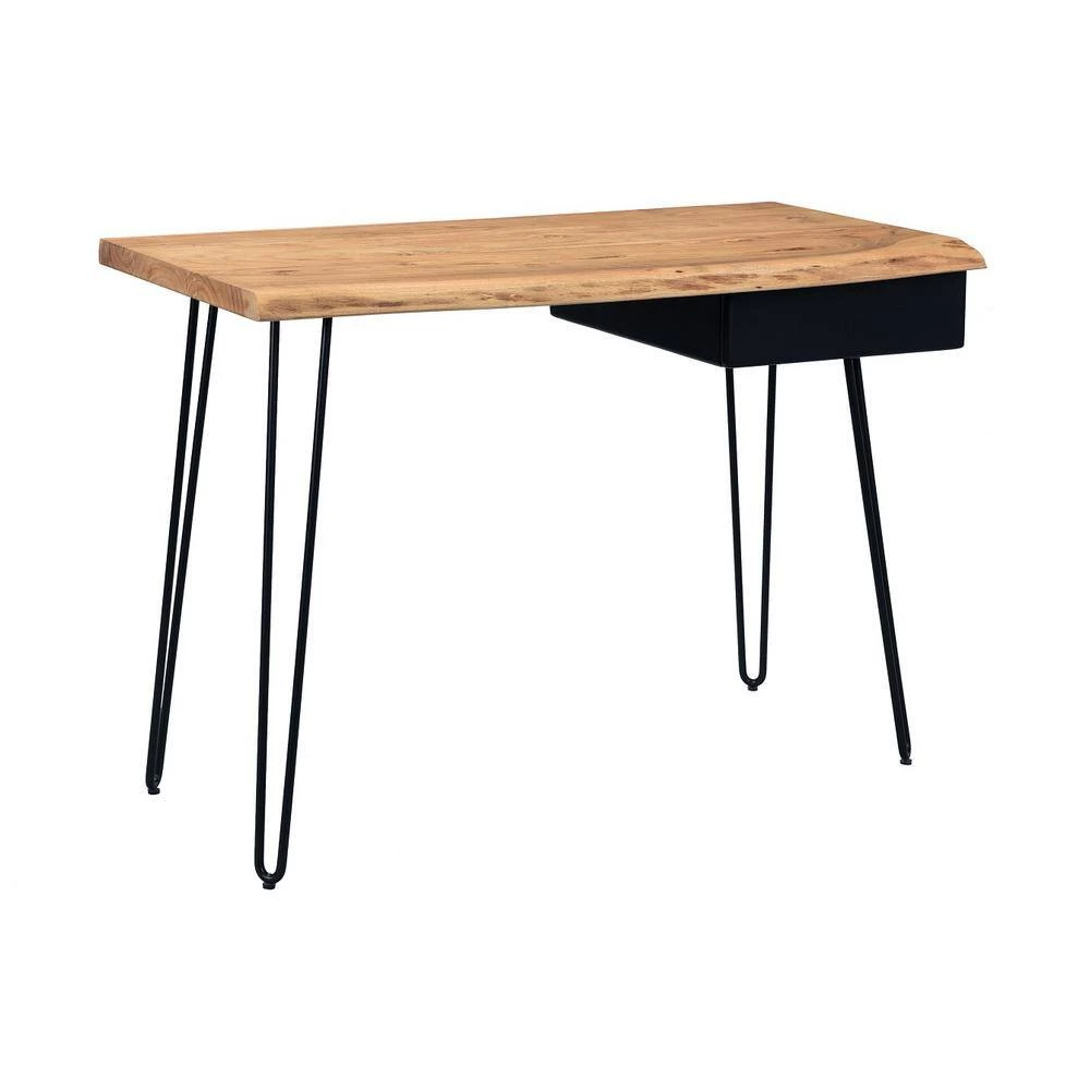 Keeping it simple, airy and light, this Writing Desk is perfect for dorm rooms, home offices, or for in your kitchen. The wood grain top has a beautiful live edge – no 2-ever alike – and is perched high upon thin dark metal hairpin legs. Plus, a single drawer has been tucked neatly under one side, giving you have a place to keep your papers, pens and laptop safely stored away.