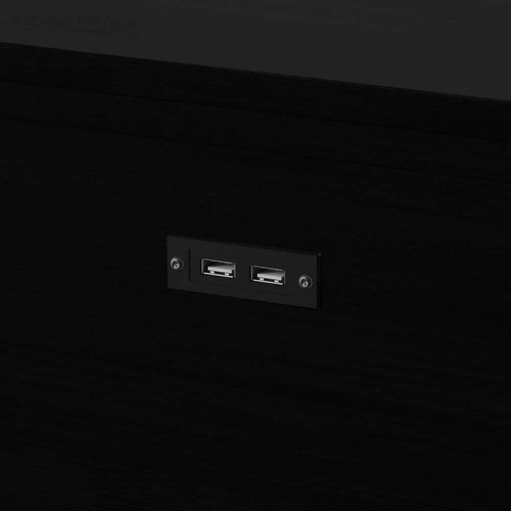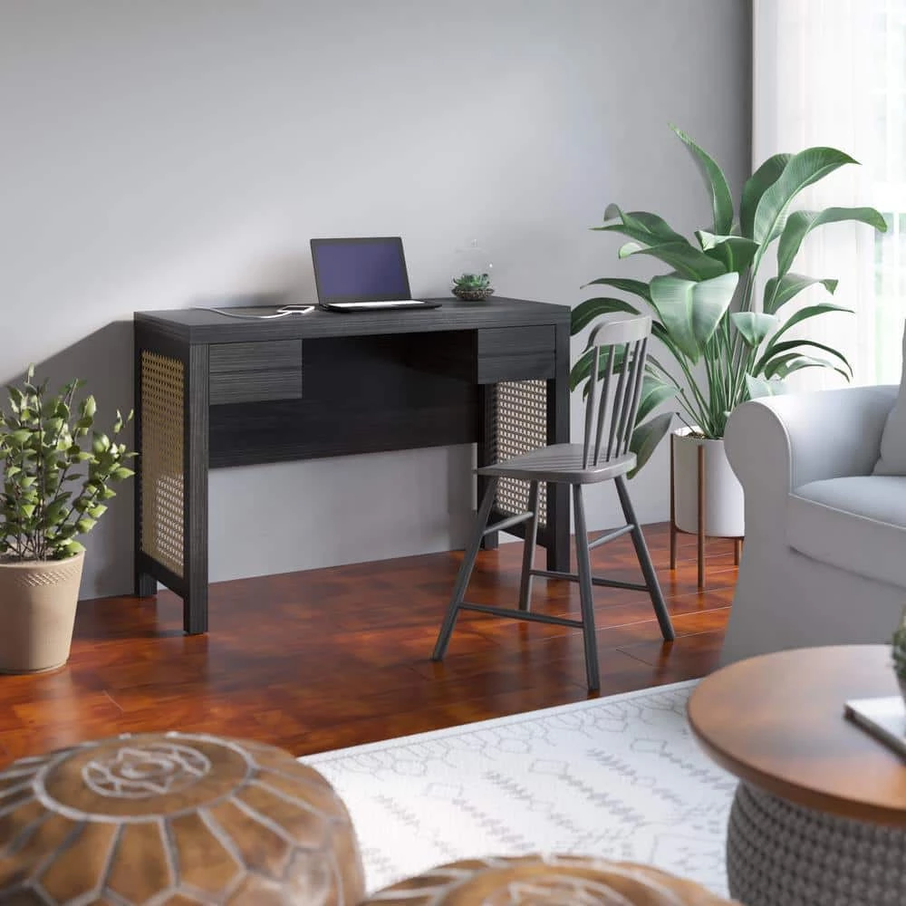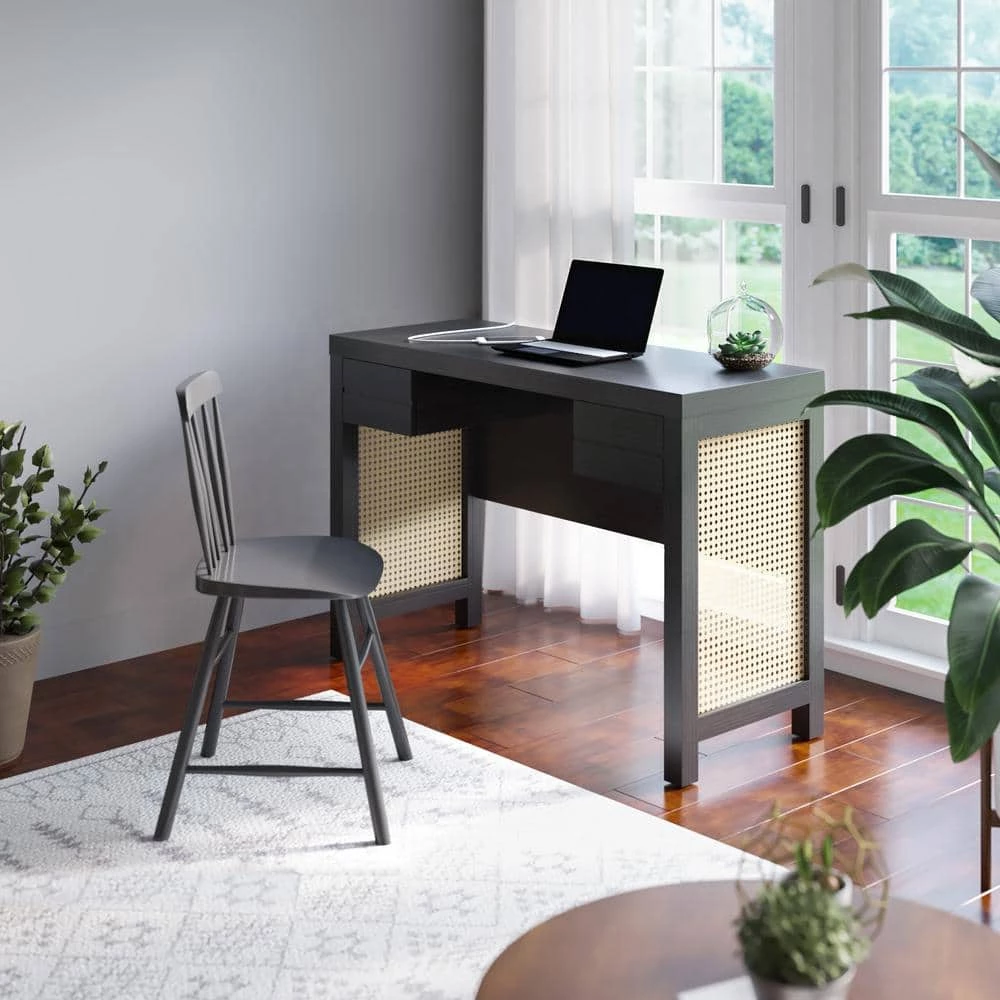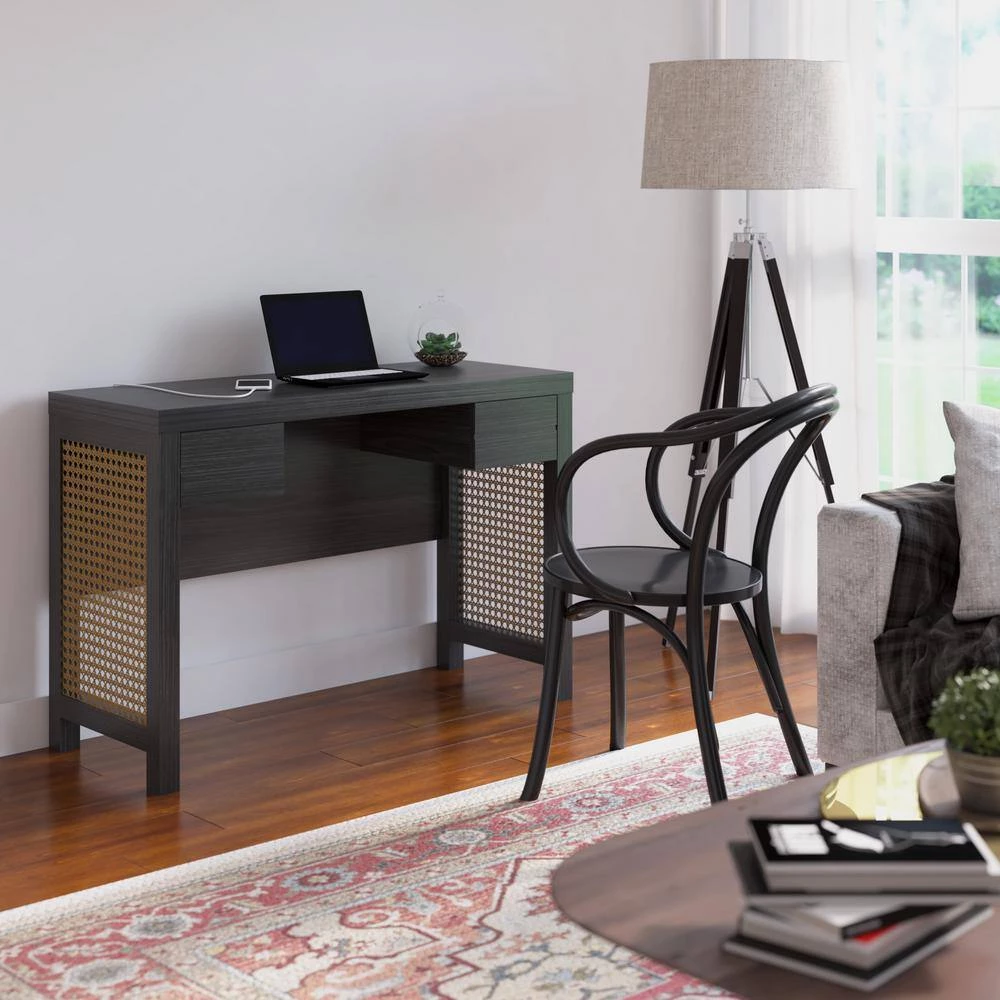 This desk mixes mid-century style and modern functionality with USB charging ports and woven cane side panels. The 2-built in USB power ports offer integrated charging for your phone, tablet, or other tech to keep you powered throughout the day. There is also a drawer on each side of the desk for storing writing utensils, important documents, or the chargers for your electronic devices. Use this multifunctional piece as a desk in your home office or as a convenient entryway console table where you can grab your freshly charged phone before heading out the door.