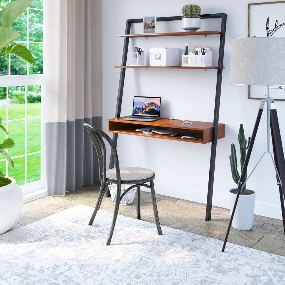 This leaning desk with USB charging is full of style and versatile. The 3-open levels offer a spot to work on your laptop, put on makeup, or showcase your favorite books, family photos, and decorative home accents. Whether you place the desk in your home office or create a launchpad in your foyer, the 2-built-in USB power ports make it easy to keep phones, tablets, and other devices powered up and ready for use. The lowest level features an open-faced compartment for-storing notepads and other writing supplies or your charger cables. Use this desk on its own in smaller living spaces or combine it with a second desk or the matching bookshelf (sold separately) for a larger, modular design.