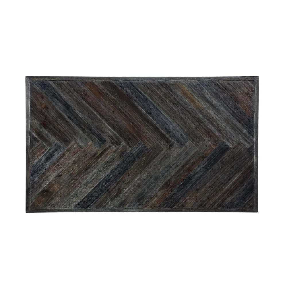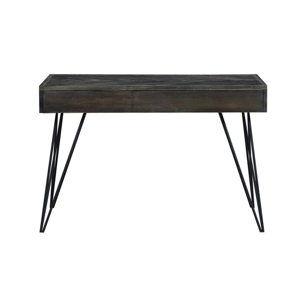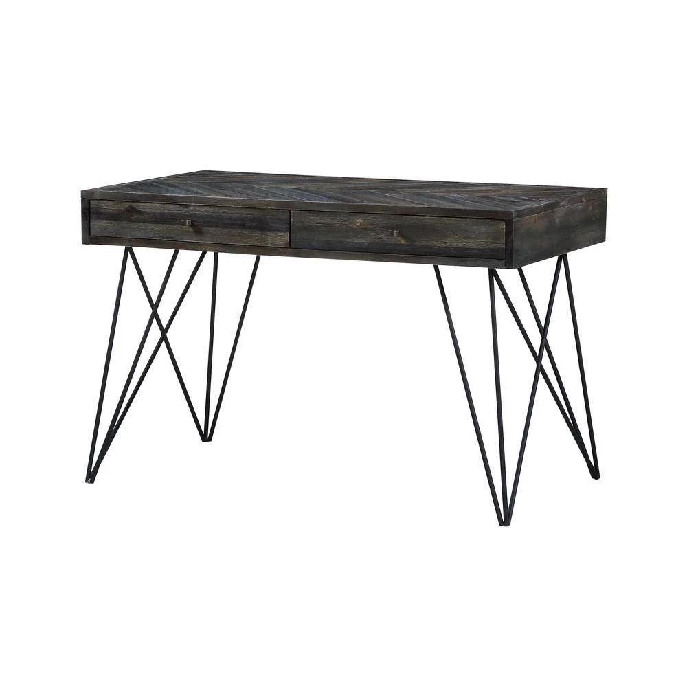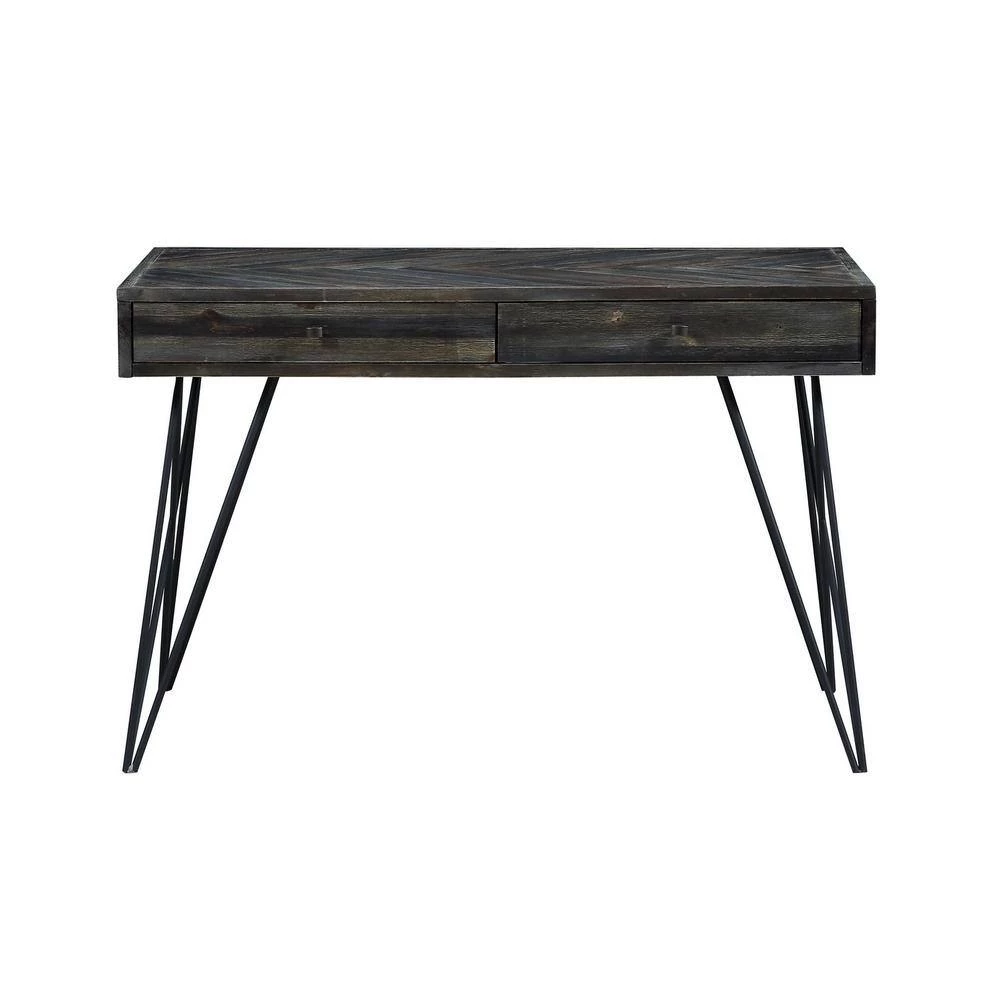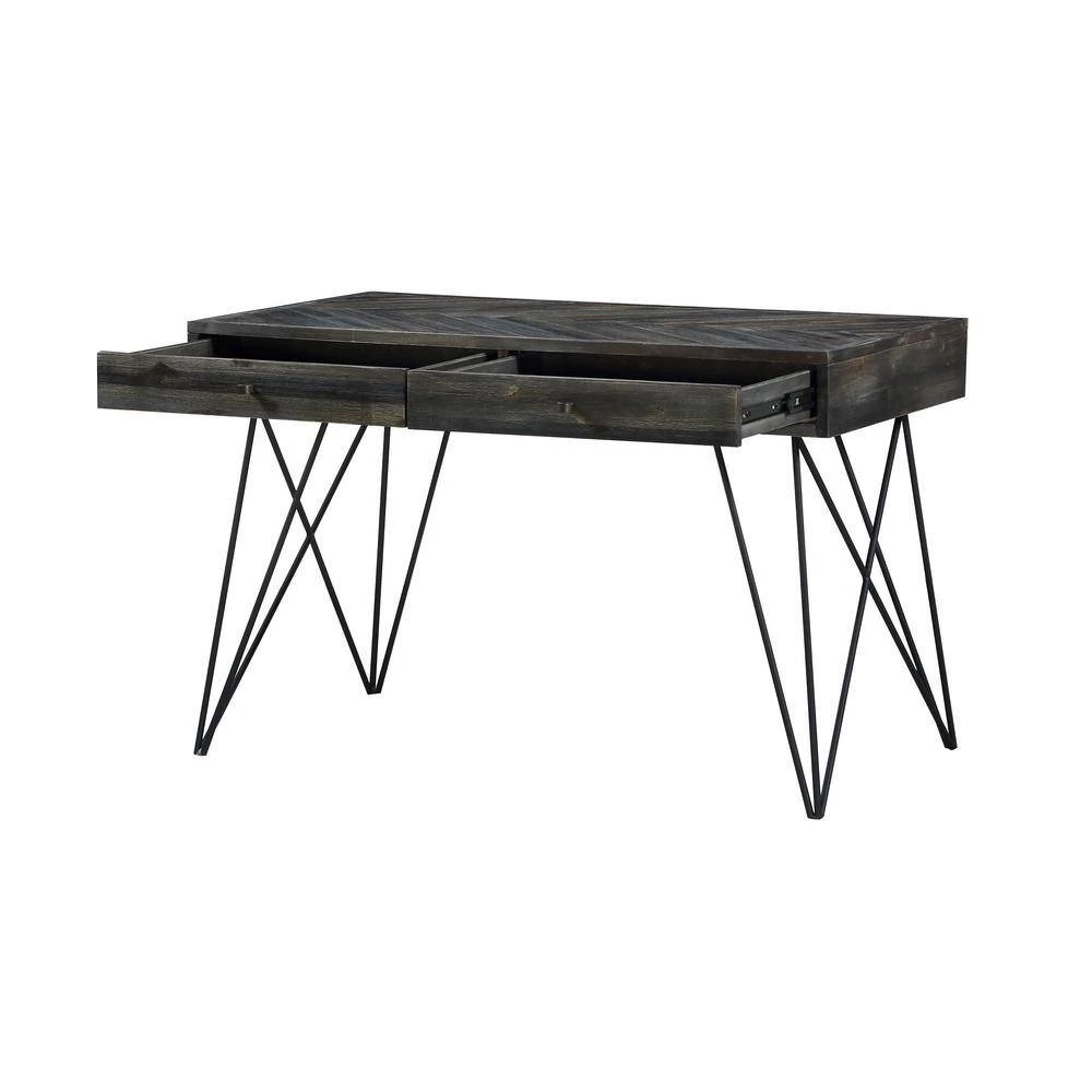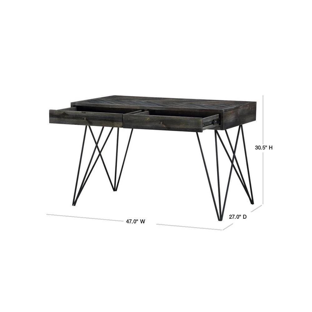 The perfect size for your home or dorm, our Writing Desk finished in a deep Aspen Court with a herringbone pattern on the top has a spacious work surface while two deep drawers to hold your laptop and papers. Held aloft on thin metal legs for a light and airy appearance and finished all the way around. You will appreciate the versatility as well as the function that this desk will provide.