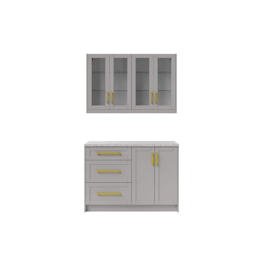 - Include – 2x 24 in. 2-glass door wall cabinet, 1x 24 in. 3-drawer cabinet, 1x 24 in. 2-door base cabinet, 1x white pearl granite top extended 48 in. 9x contemporary brushed brass handle (6-small, 3-large), 1x door handle template, 1x drawer handle template, 1x 48 in. toe kick (small), 1x 48 in. skirting (small), 2x base cabinet side panel, 2x wall cabinet skirt side panel, 1x 48 in. cabinet hanger wall rail