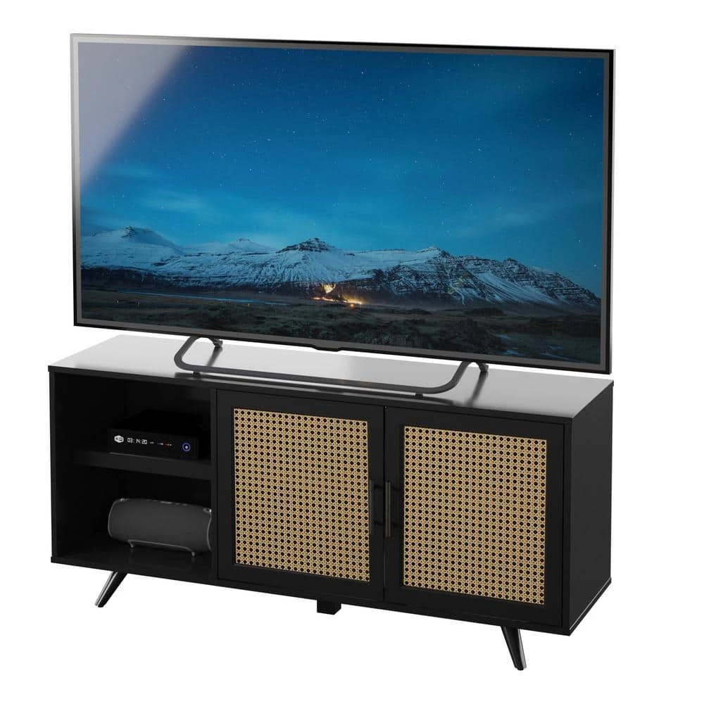 Beautifully woven cane doors and an asymmetrical design create a mix of mid-century modern and boho design for this TV stand that will hold your TV of up to 60 in. and 50 lbs. Tapered legs and a gorgeous finish add style while the double door cabinet conceals an adjustable shelf, making it easy to stow movies, games, throws or other essentials out of sight. Since remote control signals can pass through the cane doors, this is also a great spot for setting up entertainment devices. The open display area has another adjustable shelf that offers space for decorative accents, seasonal items or photos. Each side of the TV stand has back panel cutouts to route cords and prevent tangles no matter where you decide to place AV components.