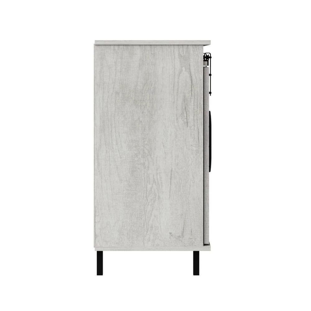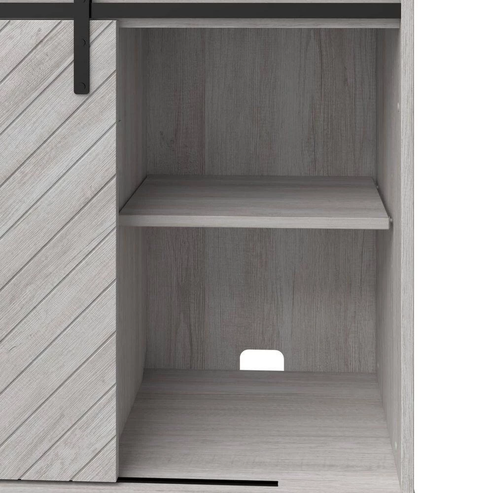 - Barn doors suspended on a metal rail system slide to conceal side storage cabinets or center storage shelves