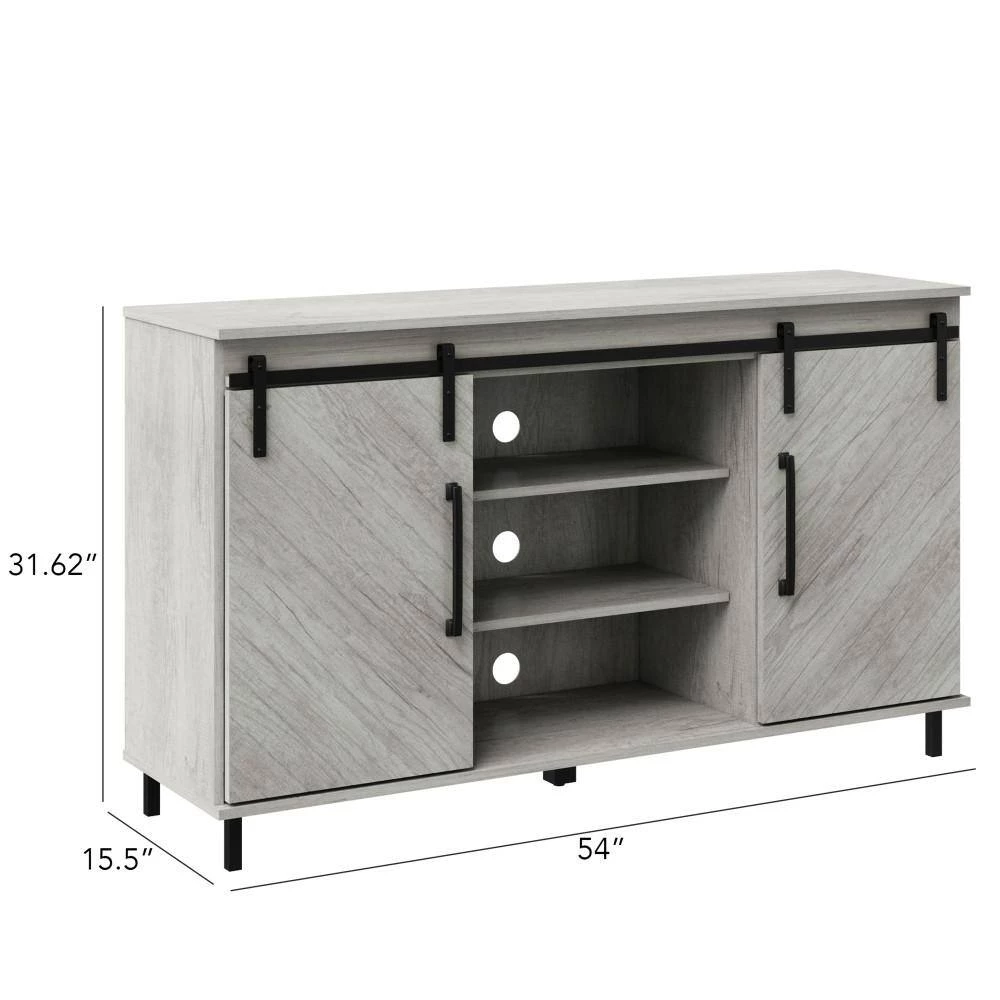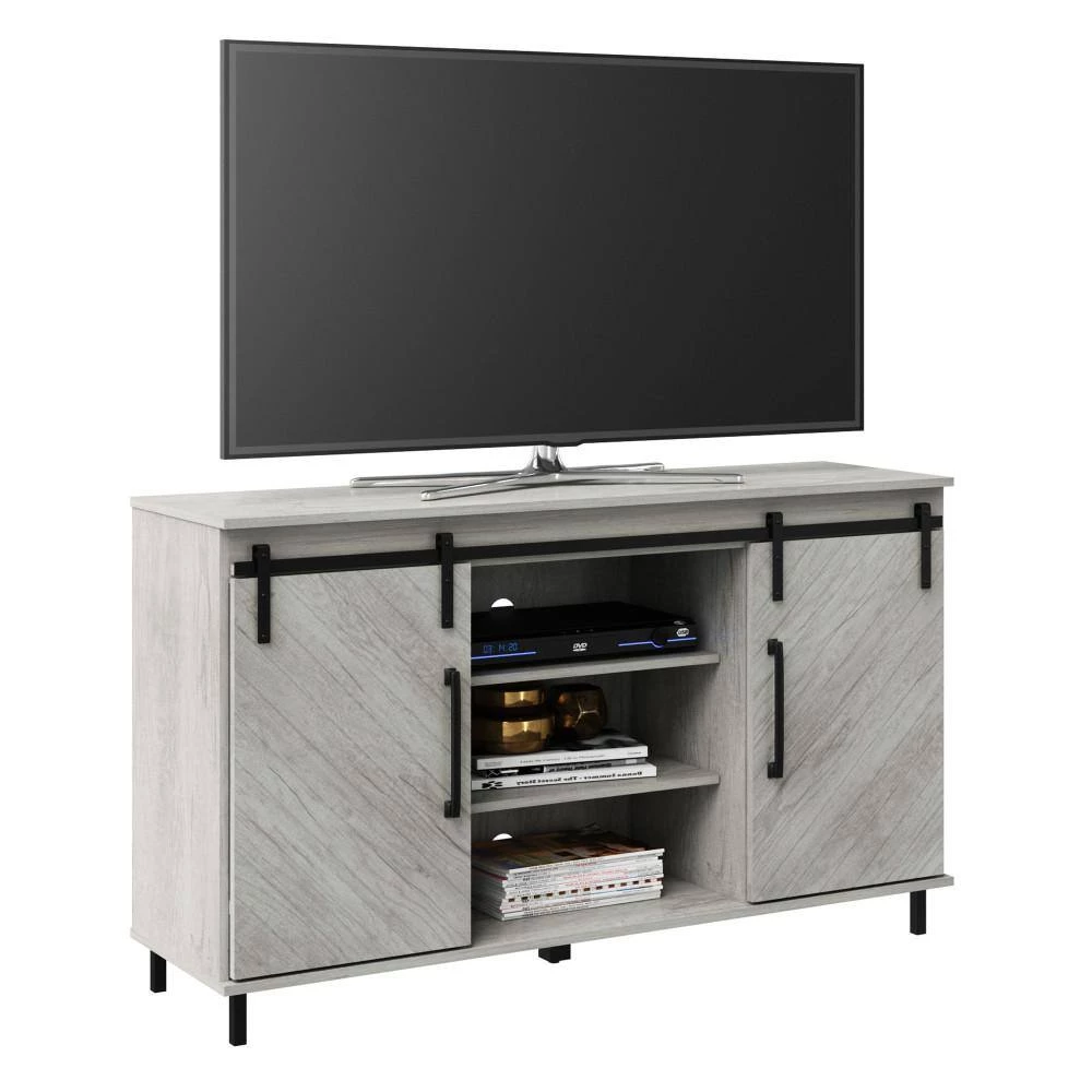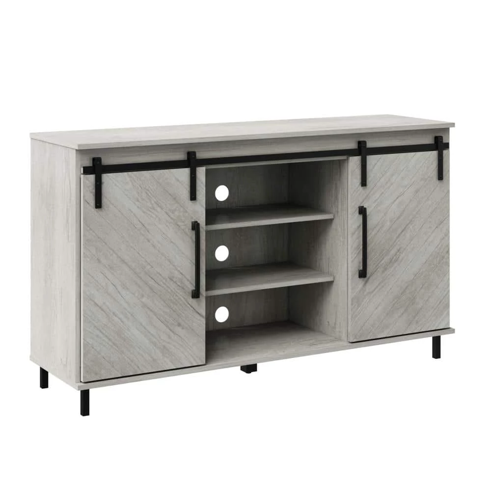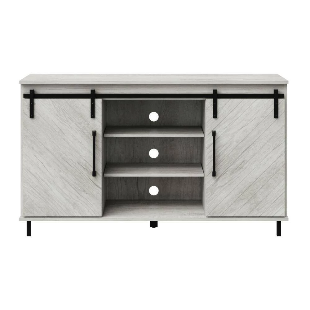 Adding a modern feel to the look of sliding barn doors, this TV stand offers style and function to your living room while accommodating your flat screen TV of up to 60 inches and 75 pounds. The doors smoothly glide along metal rail hardware and feature matching black metal handles and feet. Storage options include the center compartment with two adjustable shelves and two side storage cabinets with one adjustable shelf within each. Openings in the back panel of the TV stand allow cords from electronics to pass through and control tangles.