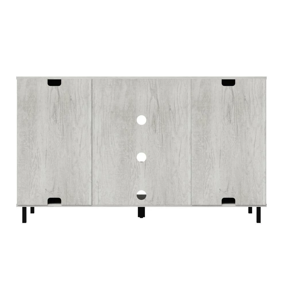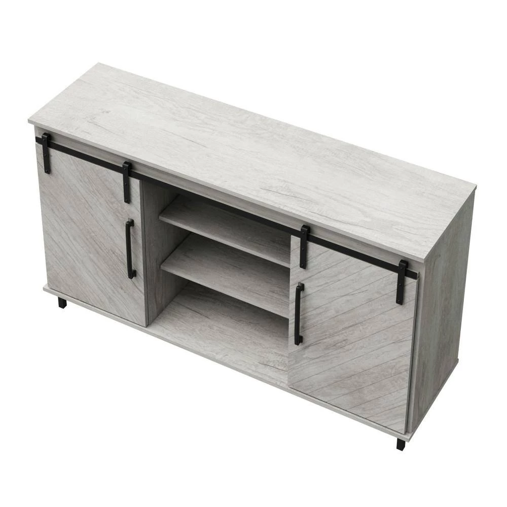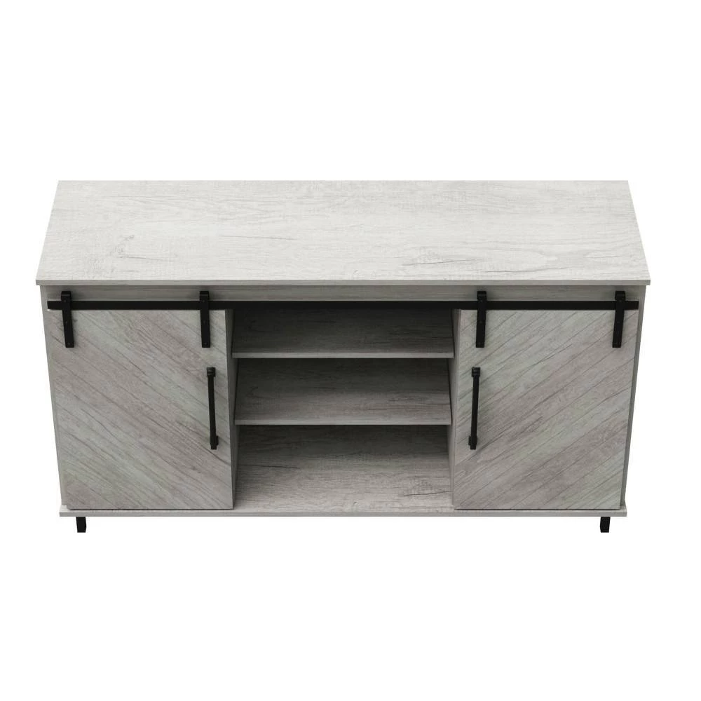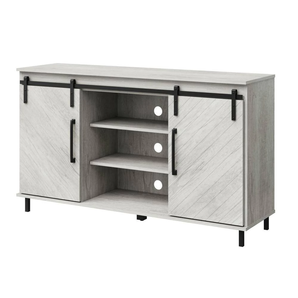 Adding a modern feel to the look of sliding barn doors, this TV stand offers style and function to your living room while accommodating your flat screen TV of up to 60 inches and 75 pounds. The doors smoothly glide along metal rail hardware and feature matching black metal handles and feet. Storage options include the center compartment with two adjustable shelves and two side storage cabinets with one adjustable shelf within each. Openings in the back panel of the TV stand allow cords from electronics to pass through and control tangles.