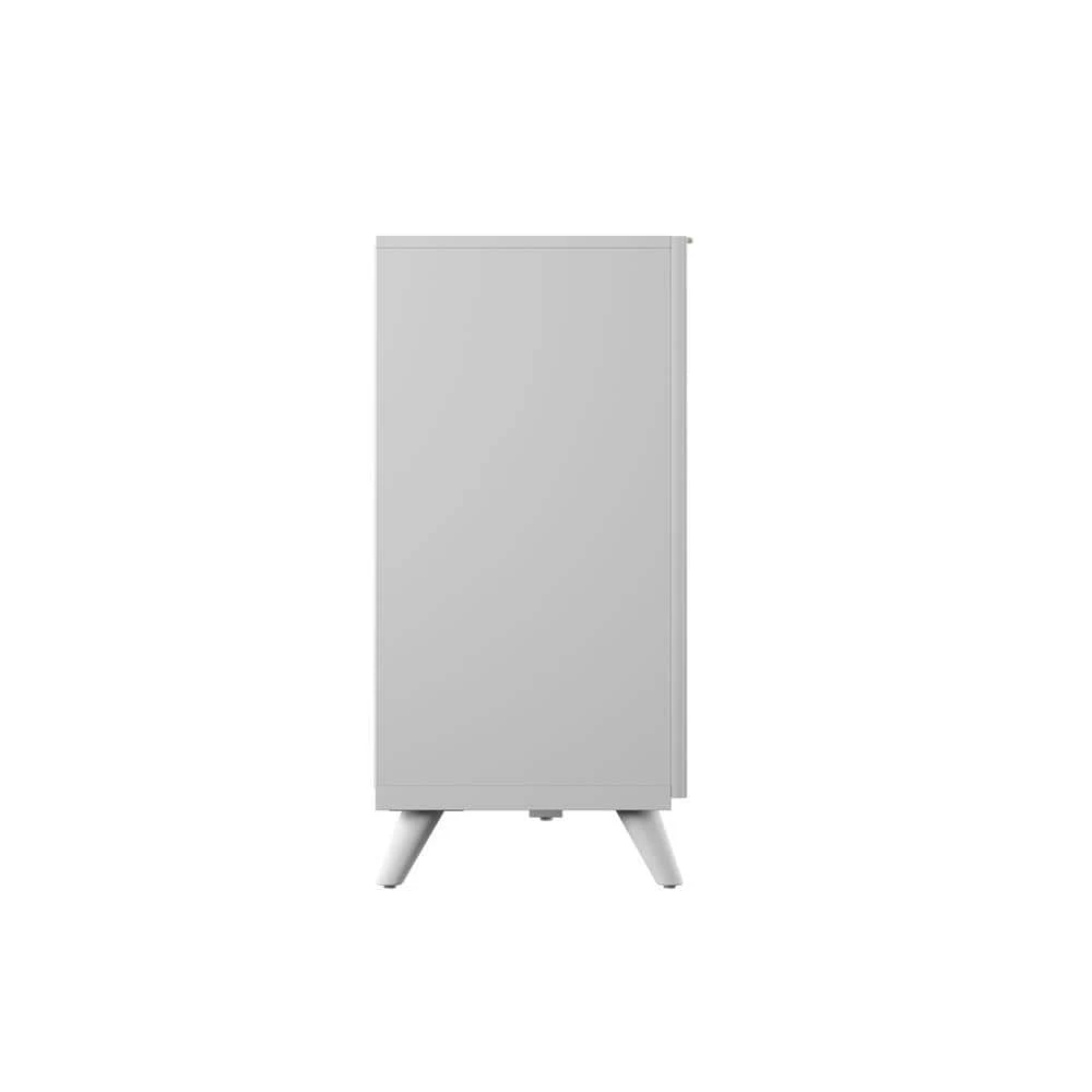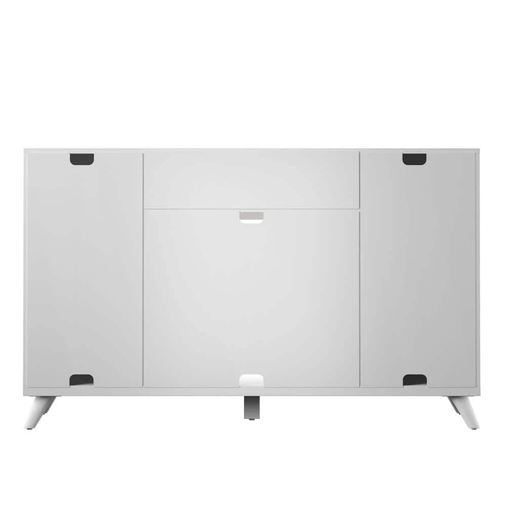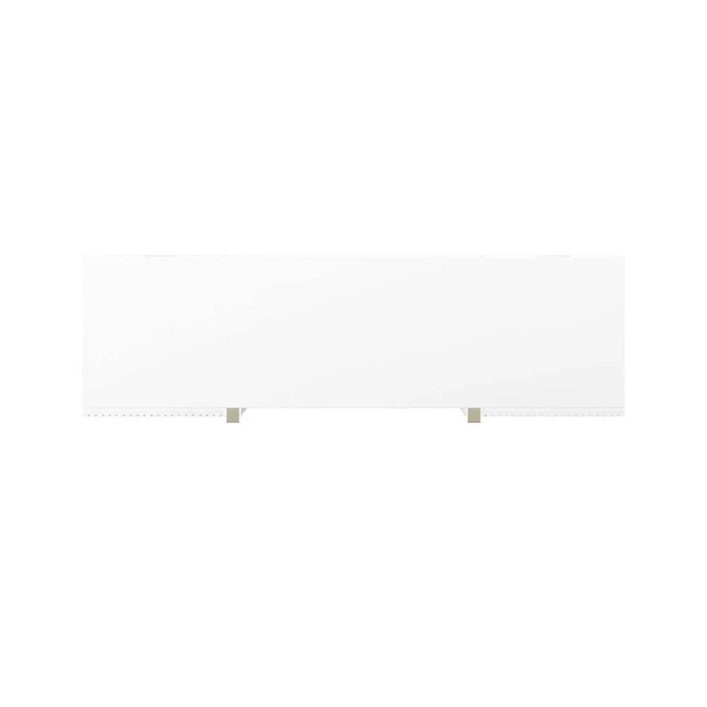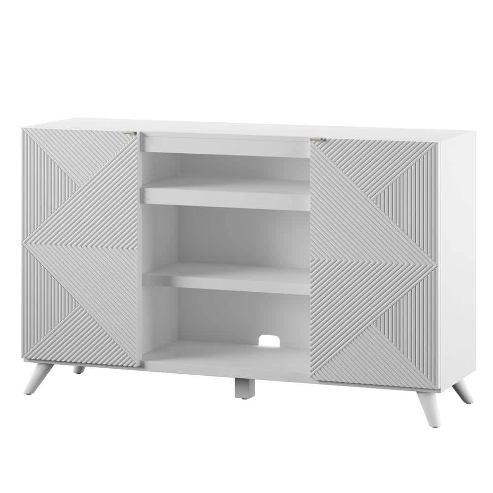 Embrace a fun, modern feel in your contemporary living room with this TV stand that offers undeniable style. The geometric patterned facade on the side cabinet doors gives subtle depth and texture. Thanks to gorgeous wood veneer detailing, expect compliments to come easy. With 2-adjustable shelves in each cabinet, having enough storage isn’t an issue. There is also an upper fixed media shelf for your cable box and another adjustable shelf in the center for even more flexible storage of your other AV components. For a widespread style refresh in your home, get the matching accent cabinet.