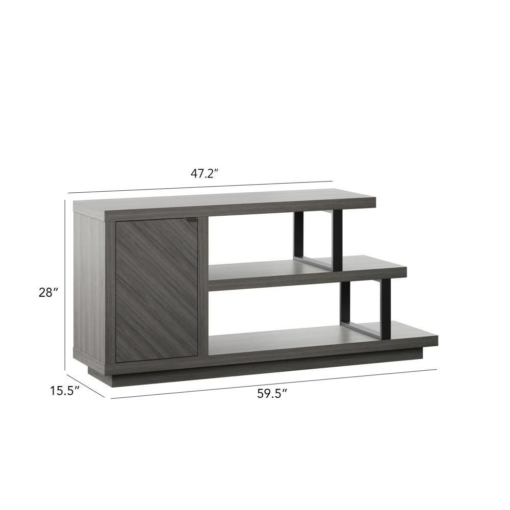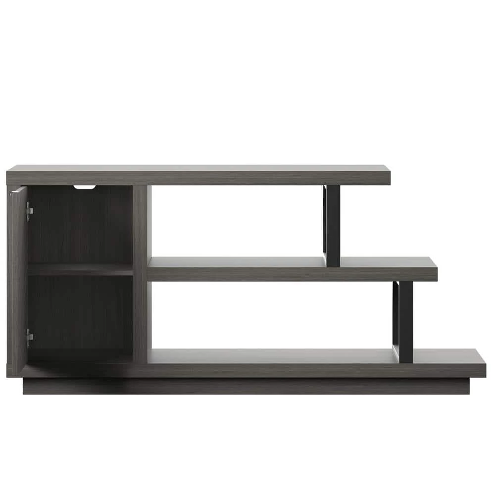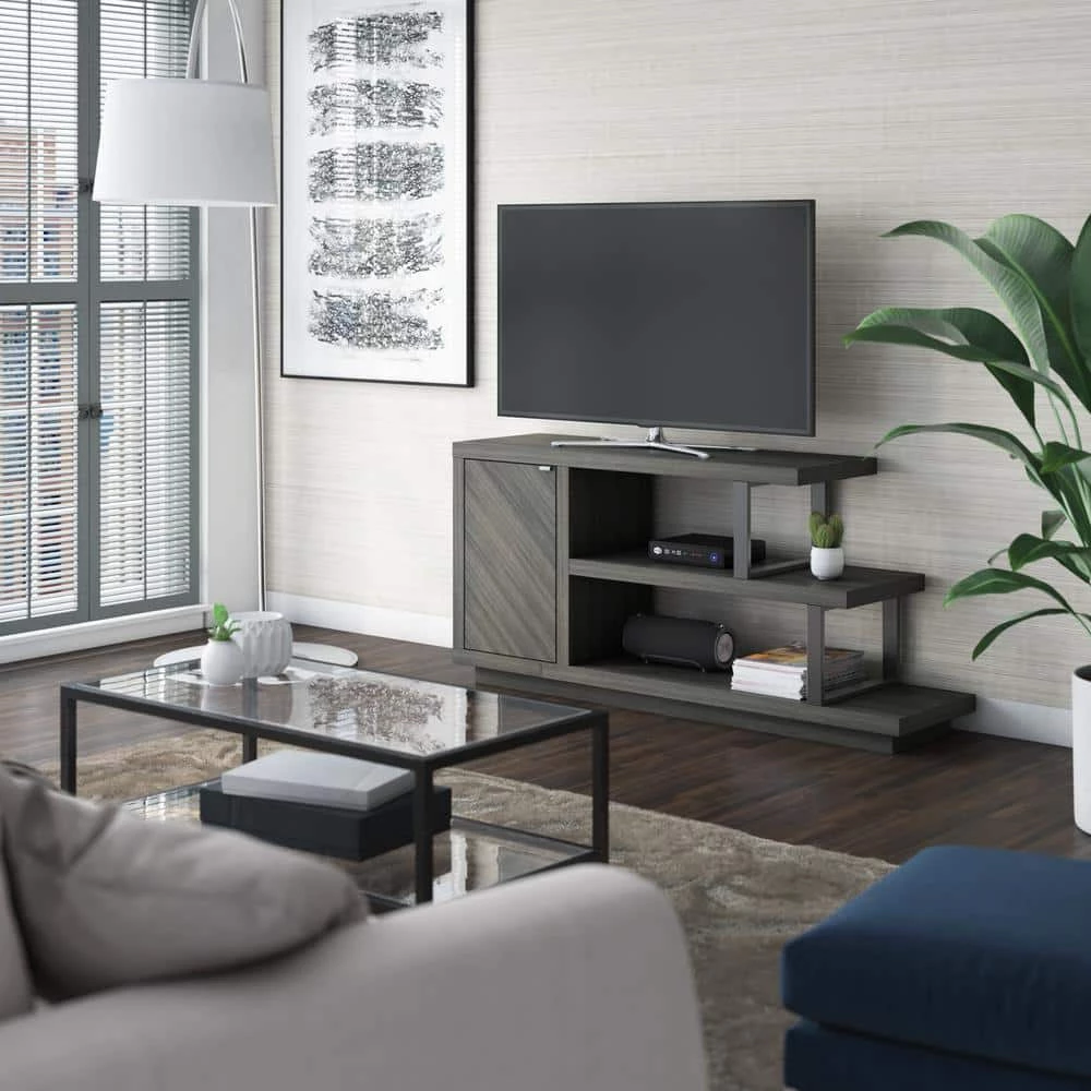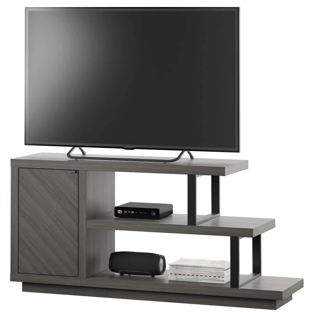 With an eye-catching asymmetrical design and modern style, this TV stand is an ideal addition for your contemporary living room. Open shelving at one end creates room.to showcase home accents like family photos and seasonal decor. or display your favorite books and movies. A single door cabinet with a diagonal wood grain pattern beautifully conceals adjustable shelving for remotes, gaming controllers, throws, and other living room.must-haves. Hidden soft-close hinges offer a streamlined look and quiet use, while back panel cutouts neatly route cables and cords for simple setup and a tidy appearance. Designed to accommodate most TVs up to 55 in., this stand will let you catch up on your favorite series or watch every game in chic style.