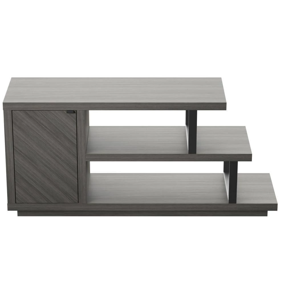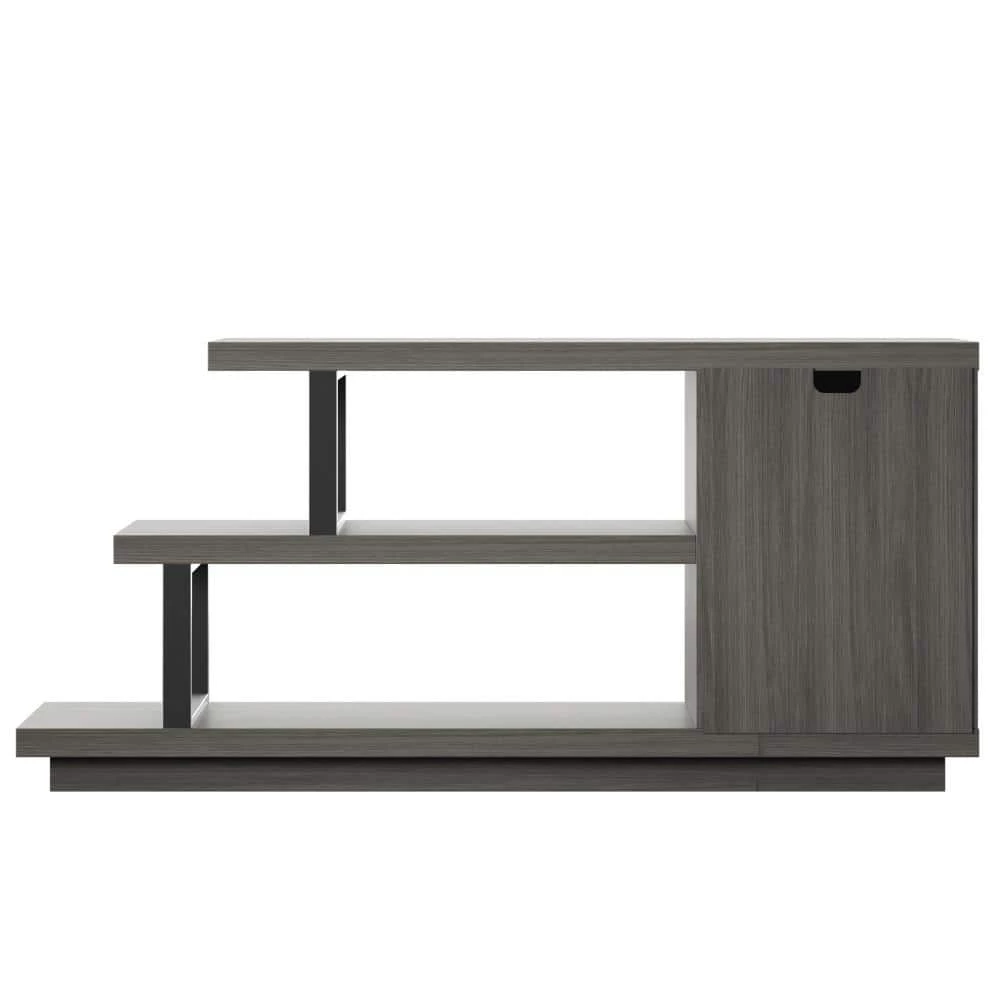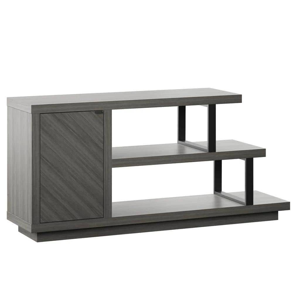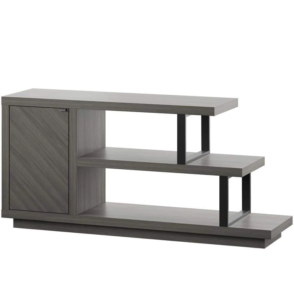 With an eye-catching asymmetrical design and modern style, this TV stand is an ideal addition for your contemporary living room. Open shelving at one end creates room.to showcase home accents like family photos and seasonal decor. or display your favorite books and movies. A single door cabinet with a diagonal wood grain pattern beautifully conceals adjustable shelving for remotes, gaming controllers, throws, and other living room.must-haves. Hidden soft-close hinges offer a streamlined look and quiet use, while back panel cutouts neatly route cables and cords for simple setup and a tidy appearance. Designed to accommodate most TVs up to 55 in., this stand will let you catch up on your favorite series or watch every game in chic style.