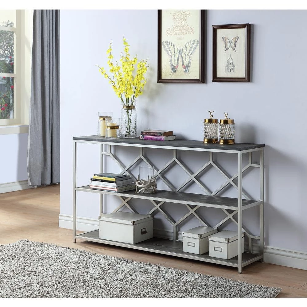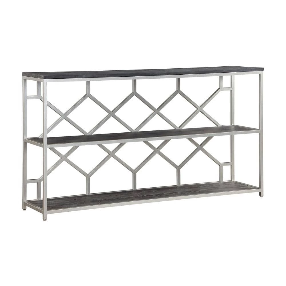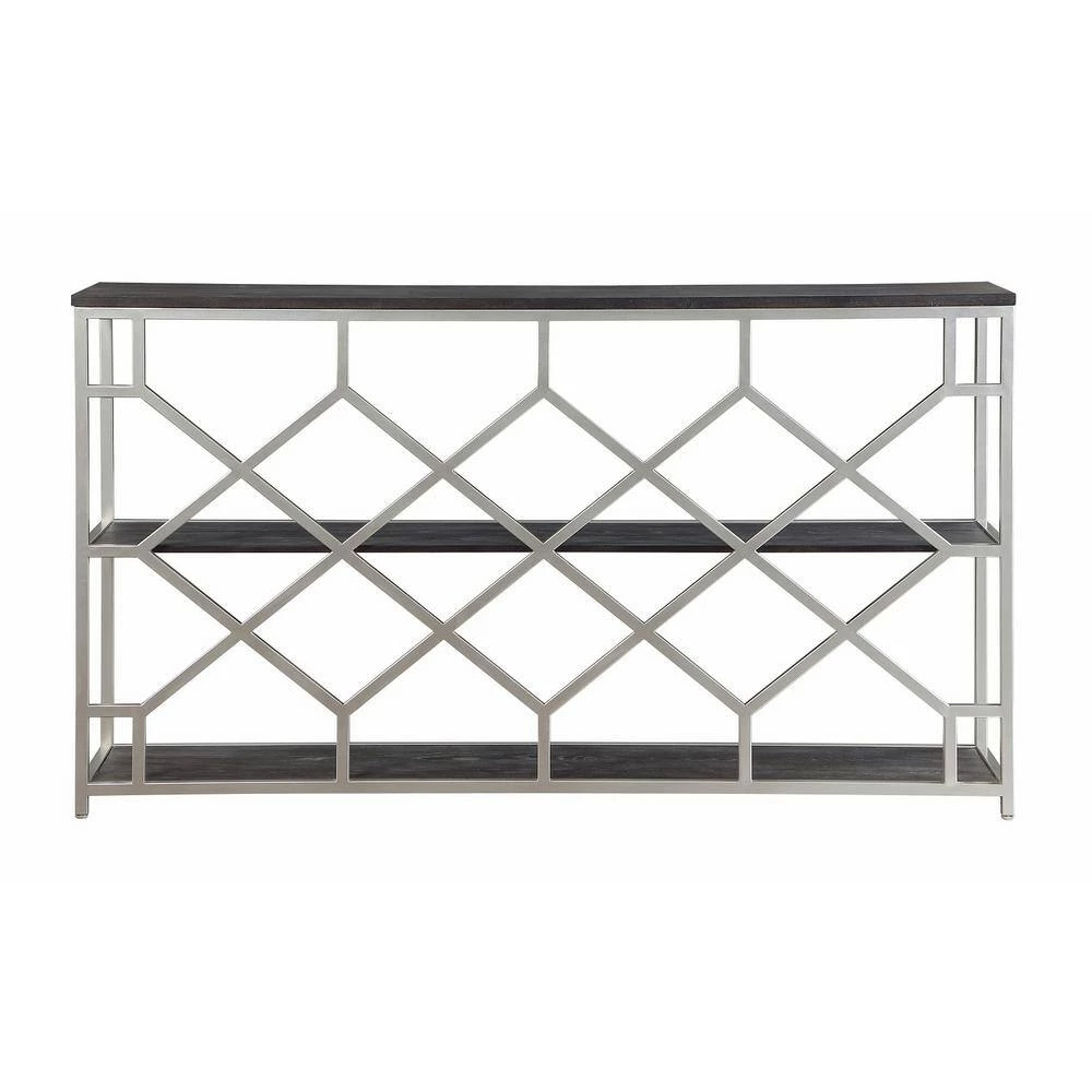 This stunning Console Table has been especially designed to be a showcase unit for any space, whether in your hallway, foyer, kitchen or den. Three long shelves finished in our Toro Dark Brown are perfect for everything from your cookbooks and vintage pottery, to baskets of books and games. The silvery metal linear frame adds just the right amount of stylish metallic, and has the added feature of a unique honeycomb design backdrop for that surprise burst of pattern. Sweet.