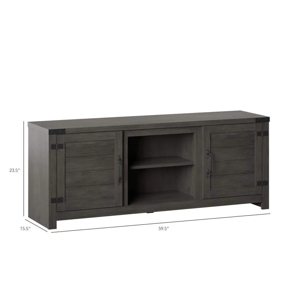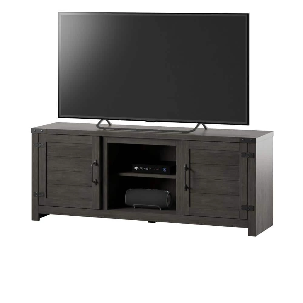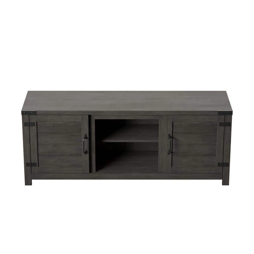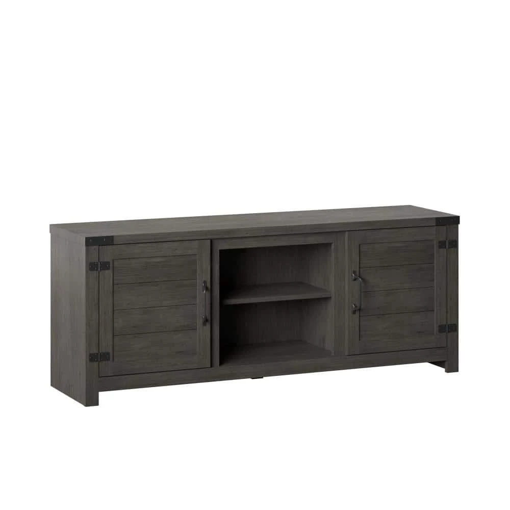This TV stand offers charming modern farmhouse character for entertaining guests or enjoying a quiet night in your living room. The cabinet doors feature a planked design with metallic door hinges and corner accents that feature nail head details for rustic flair. Each side cabinet conceals one adjustable shelf, creating the perfect spot to store movies, throw blankets, and other living room.essentials. When it comes time for football season, invite all your friends over to watch the game, since this stand accommodates most TVs up to 65 in. and 90 lbs.. Center shelving offers space for your cable box, gaming console, and other AV components.