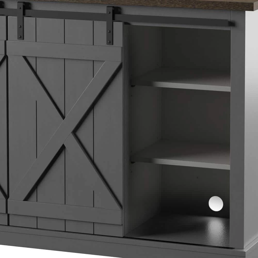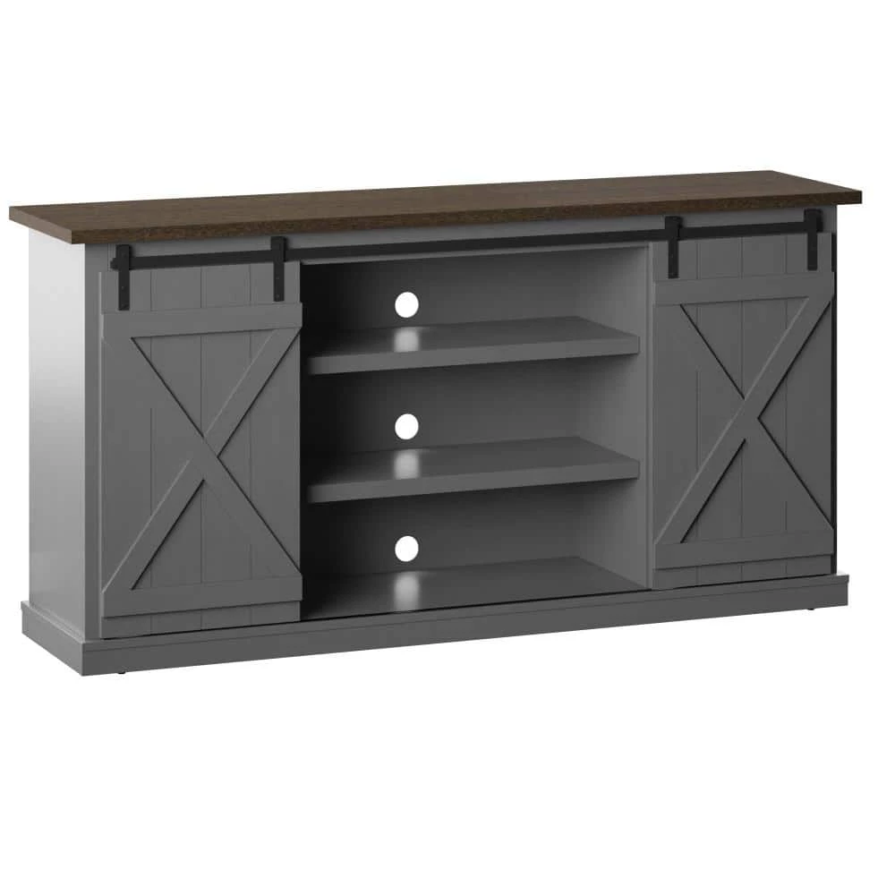- Barn style doors glide along metal rail hardware for easy access to center shelves as well as side storage cabinets for storing gaming systems, cable boxes and other AV components