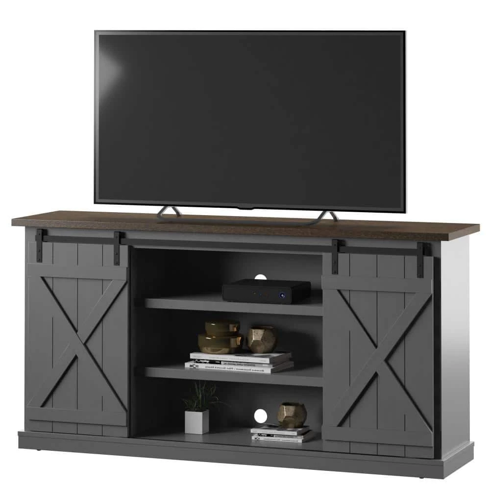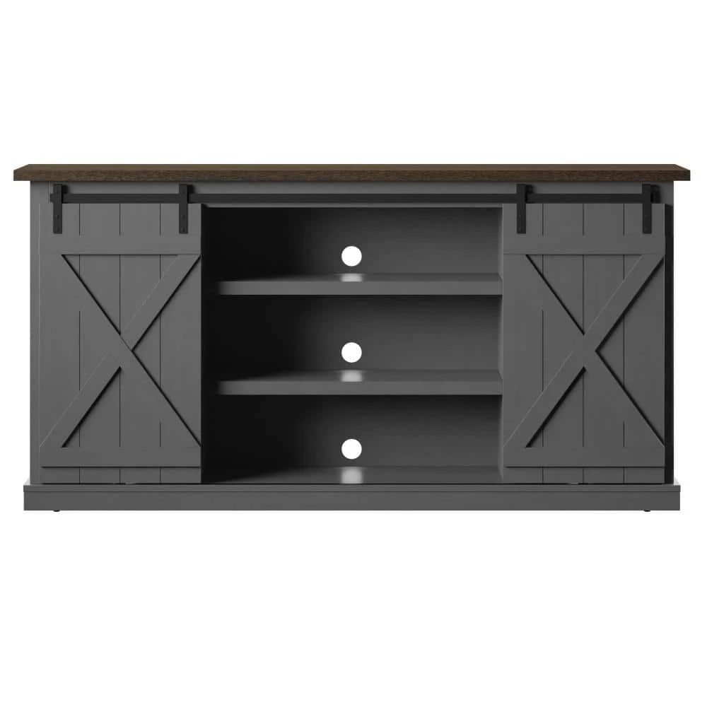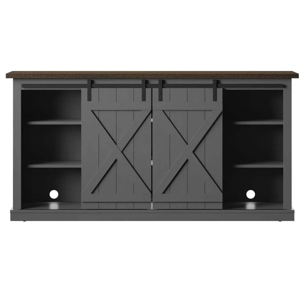 Enjoy modern farmhouse charm with this TV stand that holds most flat screen TVs up to 70 inches and 70 pounds ready for all of your family movie nights, big Sunday games, and streaming marathons. Real sliding barn doors offer a fun, rustic look and glide smoothly along metal rail hardware to open and close. The two side cabinets have two adjustable shelves each and the open, center shelf area has two adjustable shelves as well. The result is tons of storage space for cable boxes, DVRs, game consoles, other AV equipment, and even knick-knacks you love. Holes in the back panel manage cord routing to prevent tangles and add ventilation to cool electronics. If you’re looking to upgrade your entire living room, be sure to see the rest of the collection, including a matching accent cabinet, storage bench, and console table.