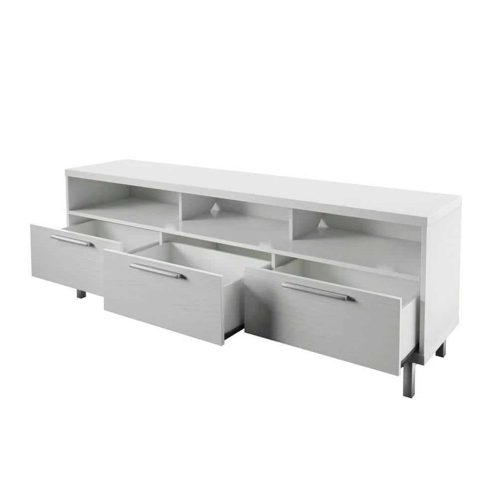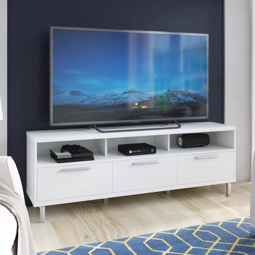 Enjoy your favorite TV shows and films with this modern TV stand that offers plenty of storage. Designed to accommodate most TVs up to 80 in. and 90 pounds, the stand is ready for movie nights, TV binge sessions, and game day parties featuring your big screen. The upper shelves are ideal for electronics like your cable box or gaming consoles. The open media bay also allows remote control signals to easily reach your AV components. Three spacious drawers below the media bay are the perfect spot for your movie collection, family games, or other living room essentials like cozy throw blankets. Sleek metal drawer handles and matching metal feet make this TV stand a beautiful addition to any room in your home.
