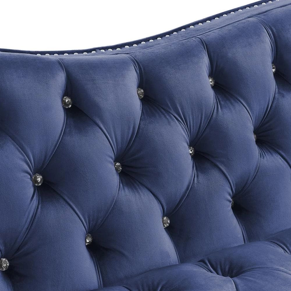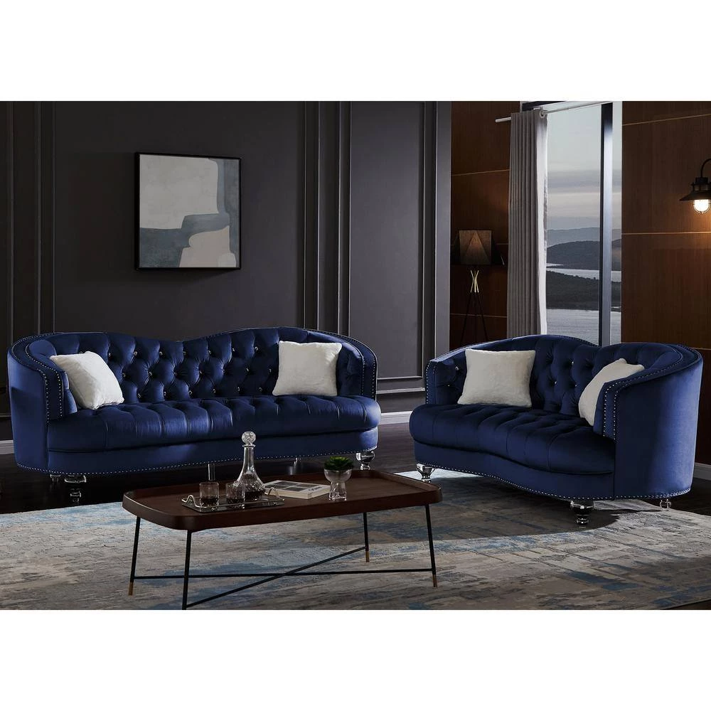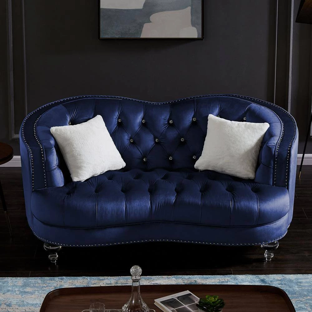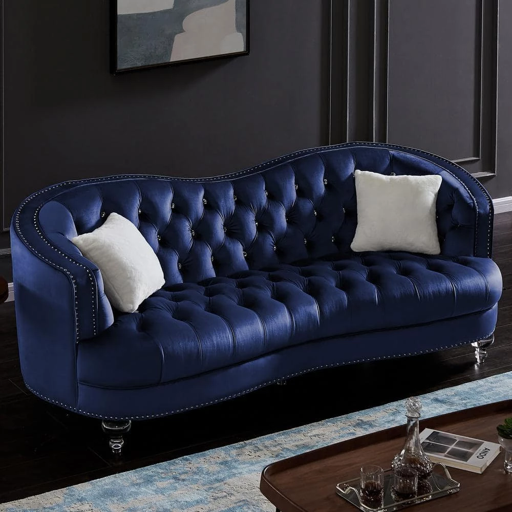 The collection includes a 3-seater sofa, a 2-seater loveseat and four pillows. Featuring deep button tufting, transparent acrylic legs and nailhead accents that combine to create an elegant Modern Victorian style. Plush velvet is deeply tufted with faux-jewel buttons. Comfort and durability, as well as great retro glam look. Upholstered in high-quality woven fabric atop premium high-density flame-retardant foam for a luxurious medium firm feels. High-strength sinuous spring suspension for long lasting comfort and support.