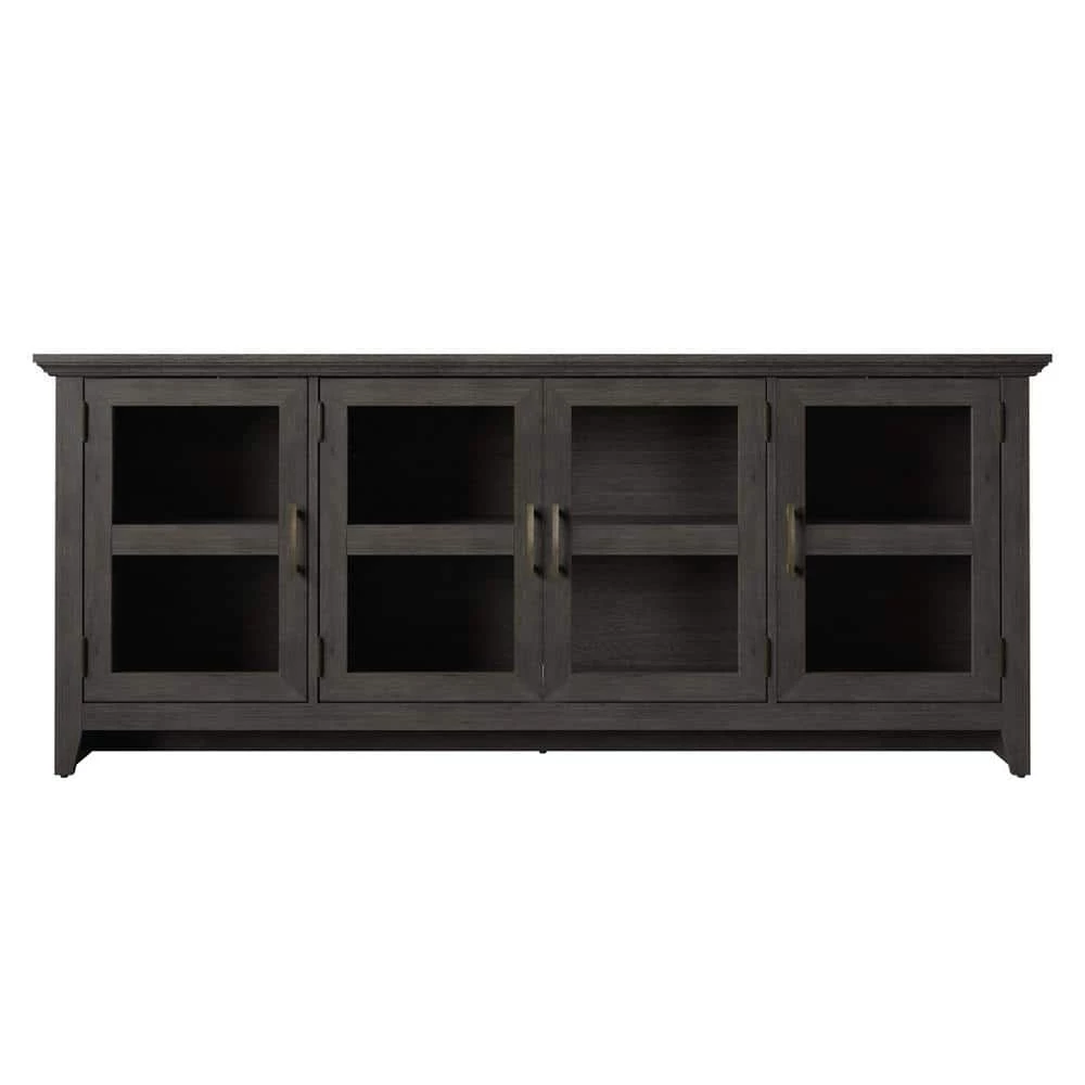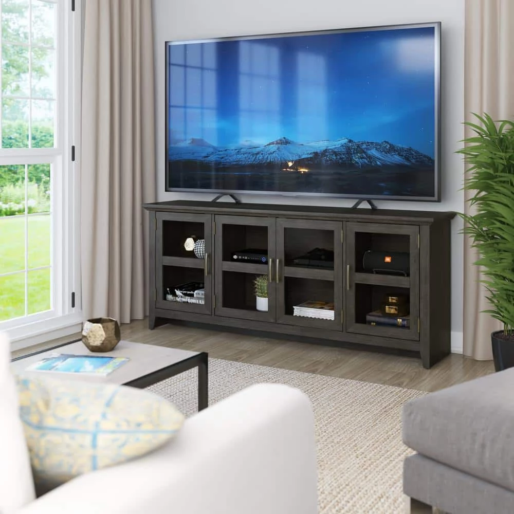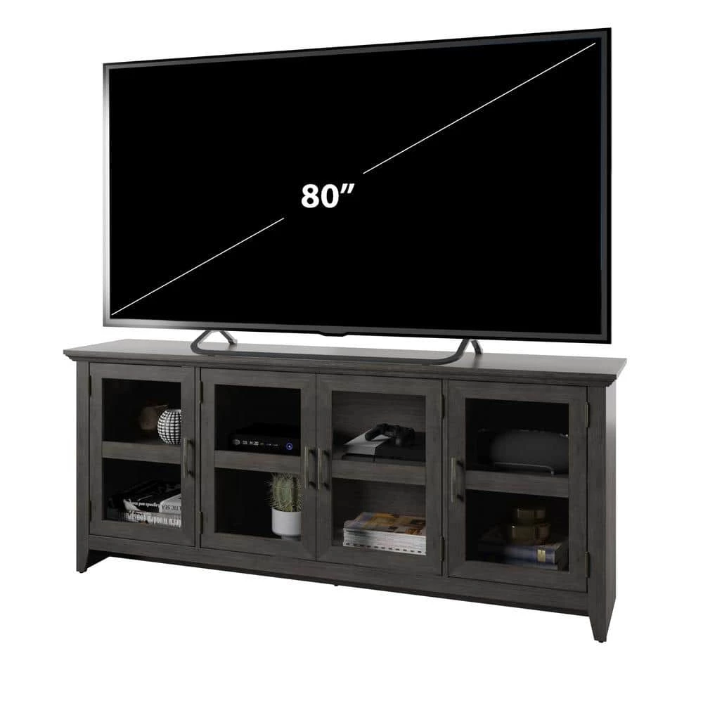 This TV stand features spacious storage and beautiful, traditional style to complete your living room, family room, or den. It securely holds most flat screen TVs up to 80 in. and 90 pounds so that you can enjoy your favorite movies and shows on a big screen in the comfort of your own home. Each side cabinet and the center double door cabinet have framed, tempered glass doors that easily allow remote control signal to pass through to electronics. Within each cabinet is one adjustable shelf for flexible storage of all your AV components and living room must-haves. Back panel cutouts manage cords and prevent tangles while also giving your electronics ventilation.
