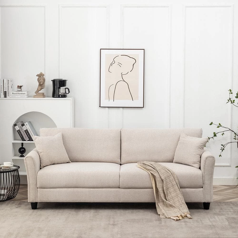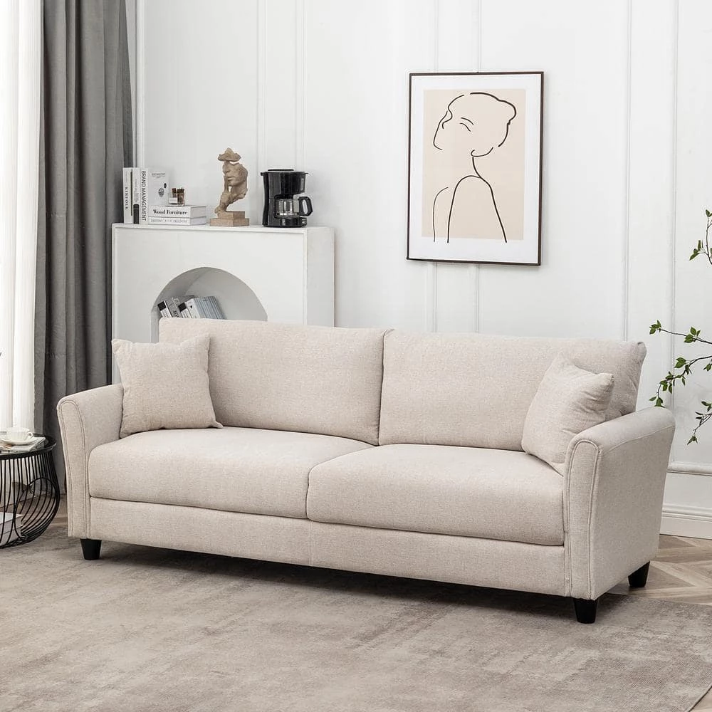 This sofa is made from polyester blend fabric and has a sturdy Eucalyptus wood frame. No tools are required to assemble. Never believe that you have to sacrifice comfort for style-this couch has it both in spades. The foam is thick, high-density, and luxuriously comfortable. Whether streaming your favorite shows or taking a quick nap, this sofa will keep you wrapped in comfort.