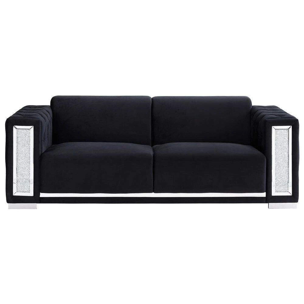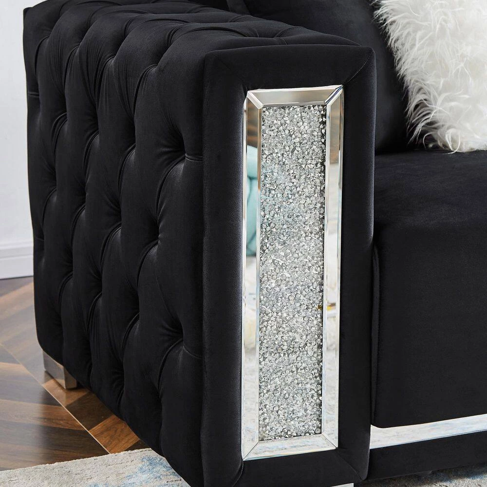 The three-seater sofa set is covered in soft velvet with tufting on the outside and inside of the armrests and backrest. Designed with the traditional chesterfield style of this sofa, square tufted arms and transparent legs. Seat cushions filled with high resilience foam and polyester fiber wadding provide comfortable, Overstuffed construction for extra comfort and longevity.Bring a high-end feel to the home with the living room sofa.