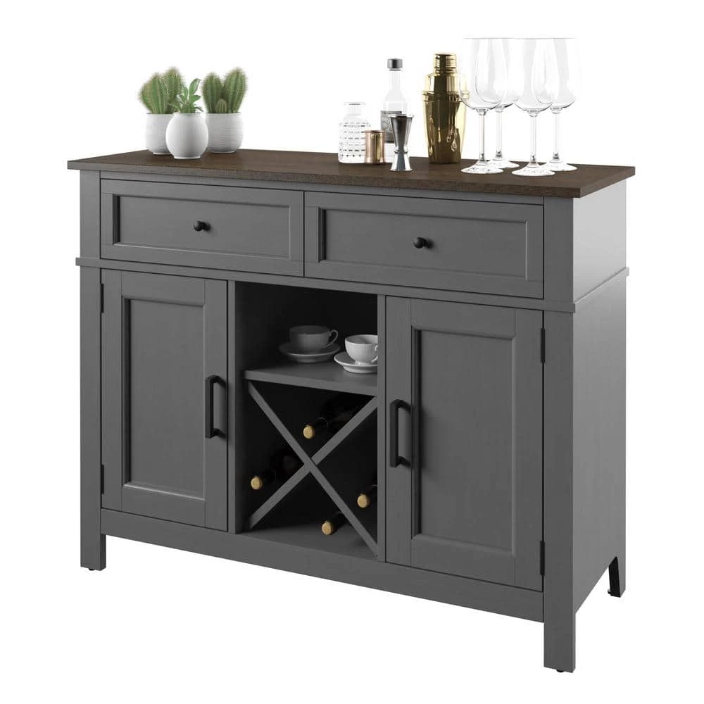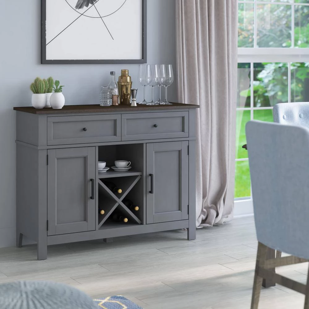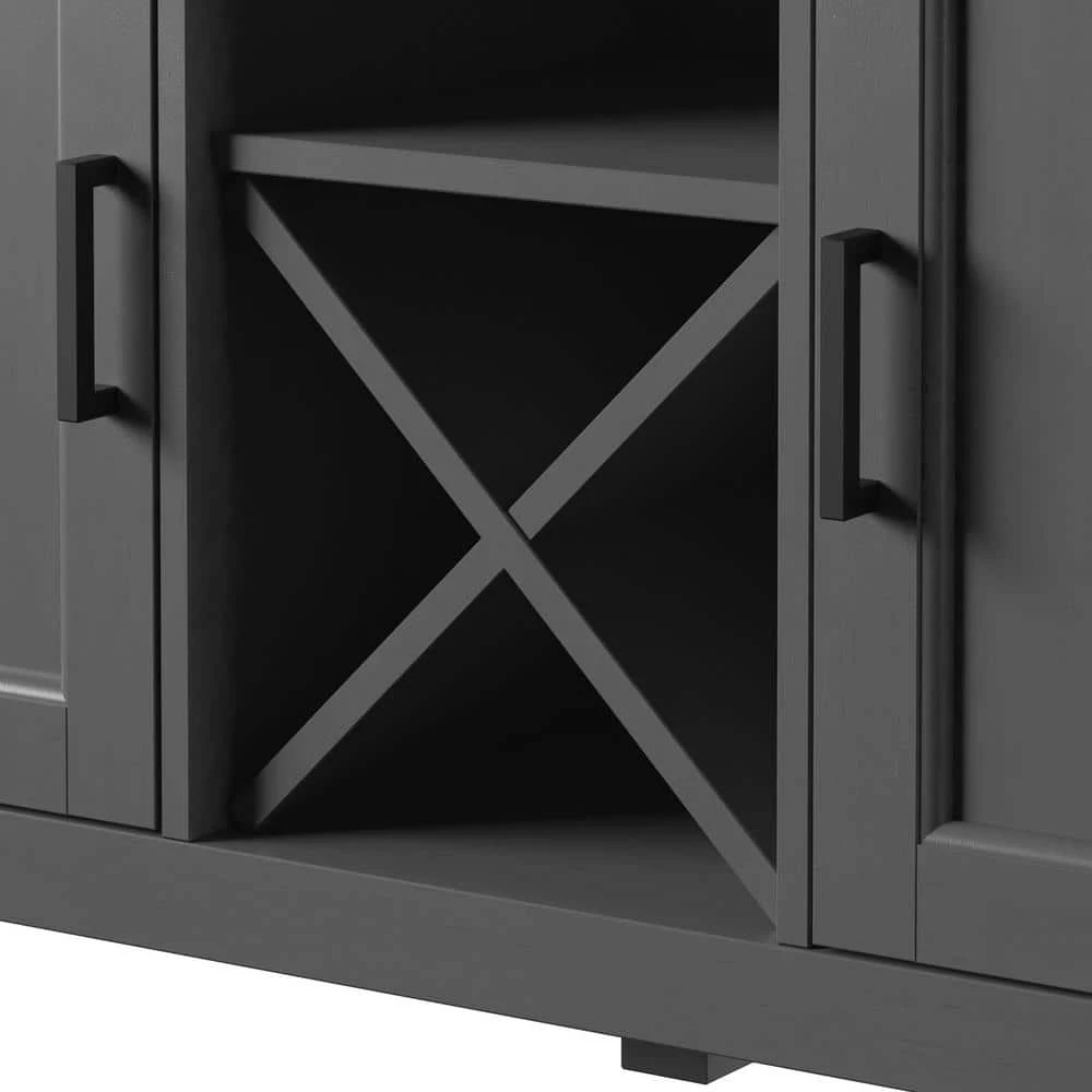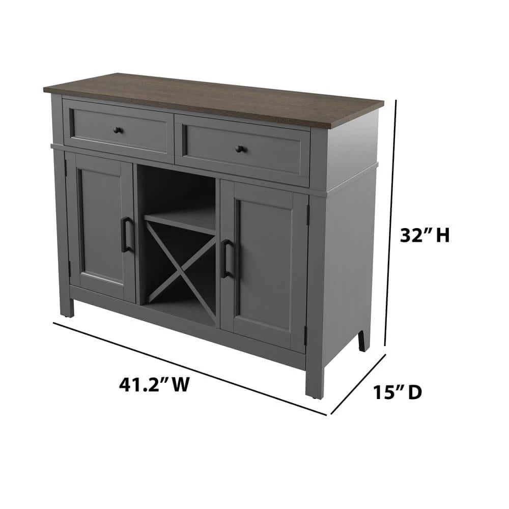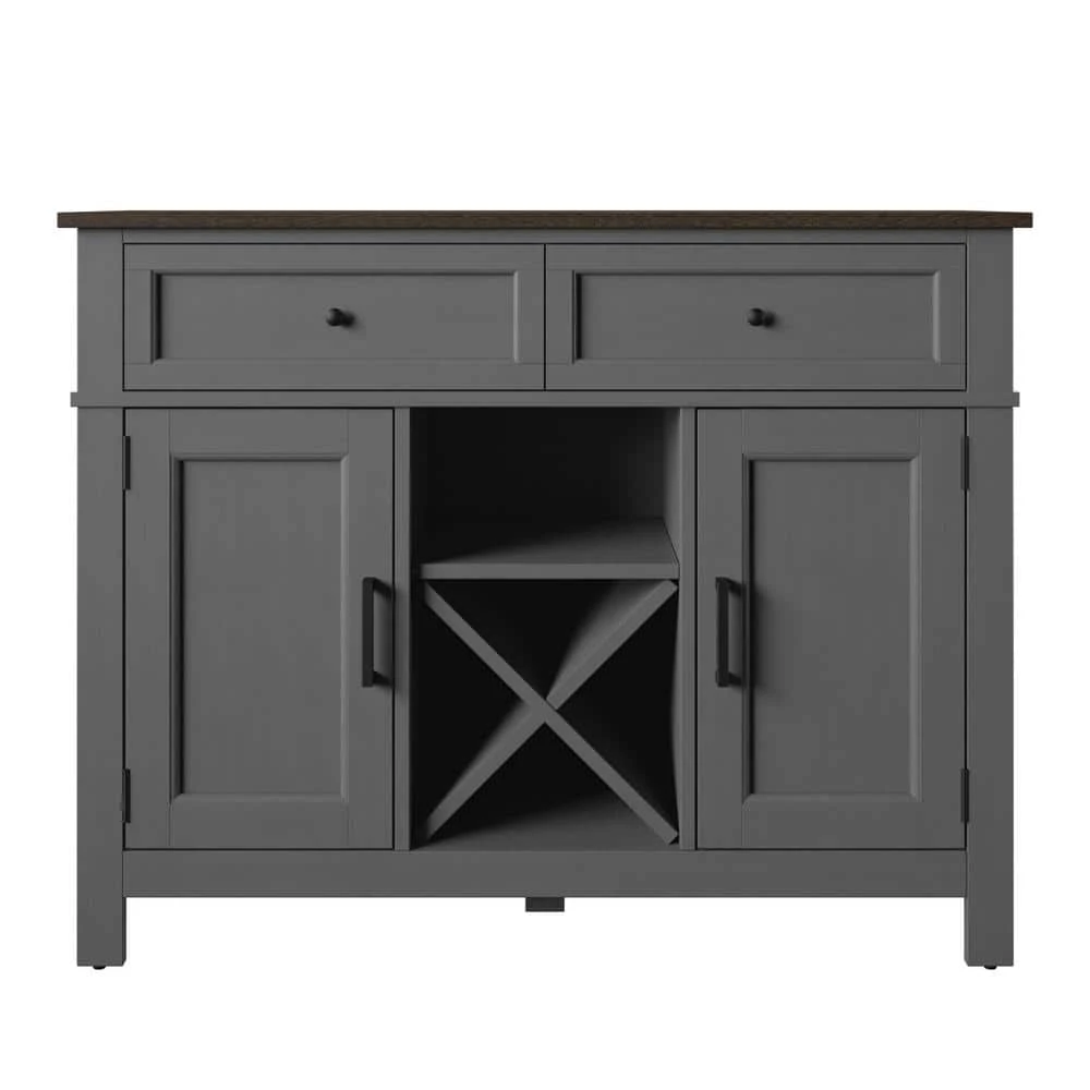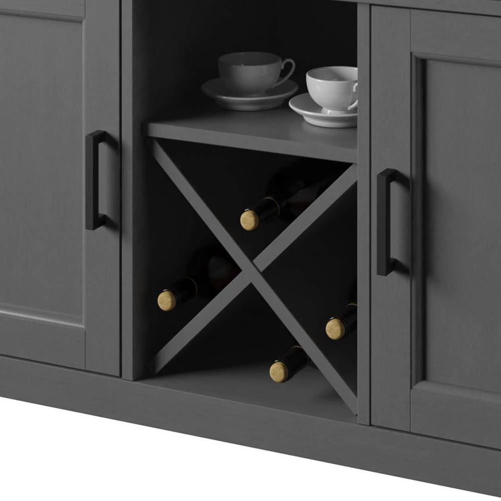 In addition to the extra storage and prep space your kitchen or dining room needs, this sideboard features beautiful modern farmhouse style and dedicated space for wine storage. Below the spacious top you’ll find two convenient drawers for storing extra napkin rings, silverware, or the corkscrew for your wine. Two lower side cabinets have one adjustable shelf each for keeping everything else you need for mealtime in close reach. Between the side cabinets is X-shaped shelving for holding your favorite wines securely on their sides. Store up to four standard-sized bottles in the wine shelving and place your stemware on the open shelf above to stay ready for guests. Back panel cutouts offer even more possibilities, like setting up your own espresso bar on the open counter or keeping baking mixers handy.