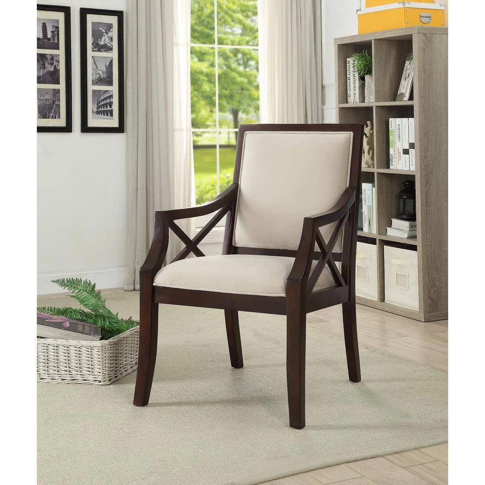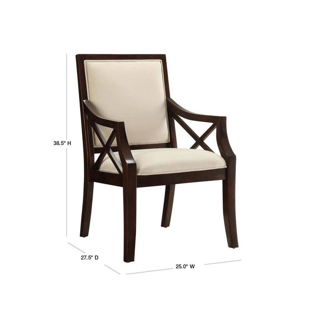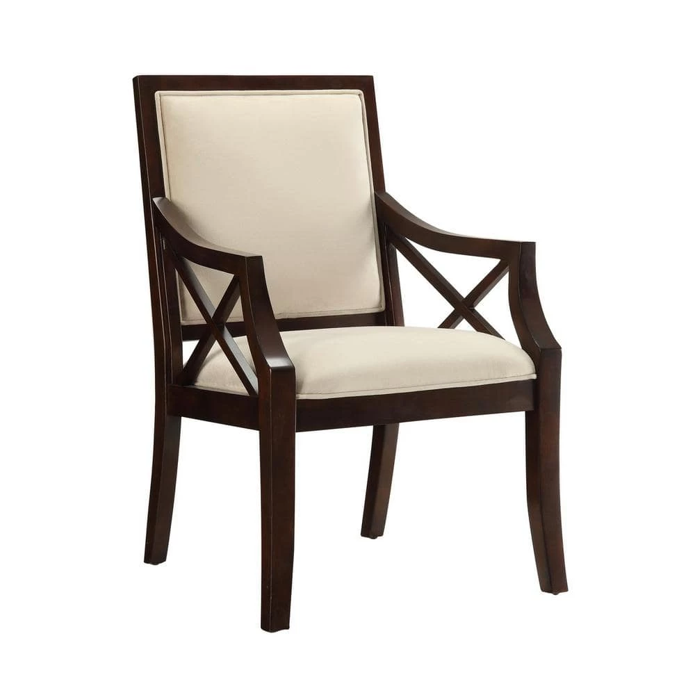 Straight forward and simple describes this classic chair. A rich Brown Cherry accentuates the square back, tapered legs and the precise curves and “X” design of the arms. The seat and back are elegantly finished in a Beige Microsuede for style and comfort.