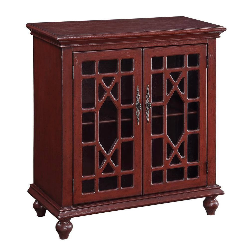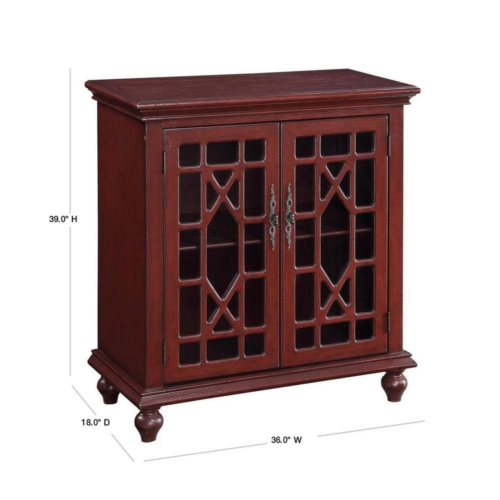 This simply designed cabinet is made special with its bright and cheerful Esnon Texture Red painted finish. The 2-doors also contribute to the personality with the Chinese Chippendale overlay treatment on the glass insets and ornate metal pulls. The interior has a shelf for more storage options.