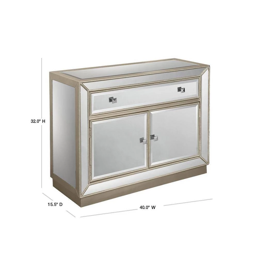 This 1-drawer and 2-door chest is sophisticated and stylish while its mirrored finish will add sparkle and shine as it reflects light everywhere. The Estaline Champagne finish creates a frame for the mirrors as does the gold tone beaded trim. The square mirrored knobs keep up the reflective theme.