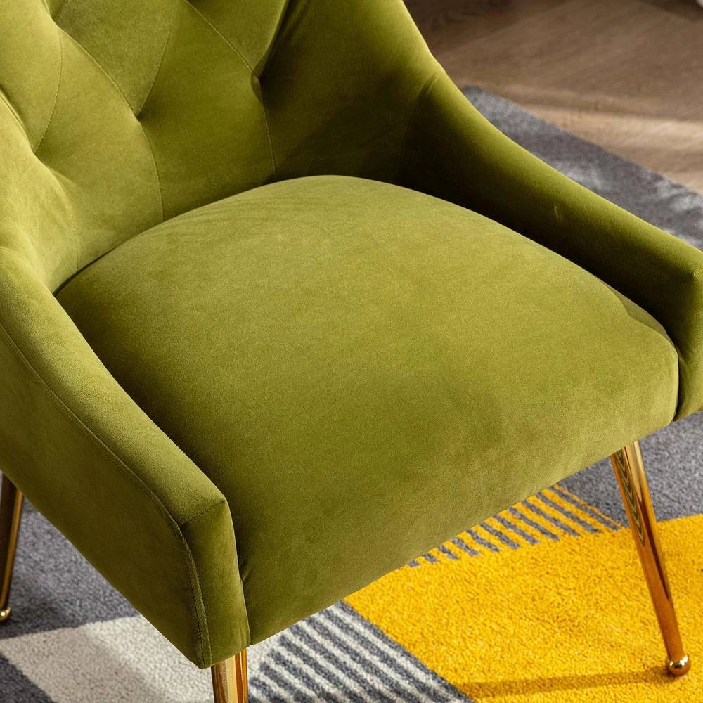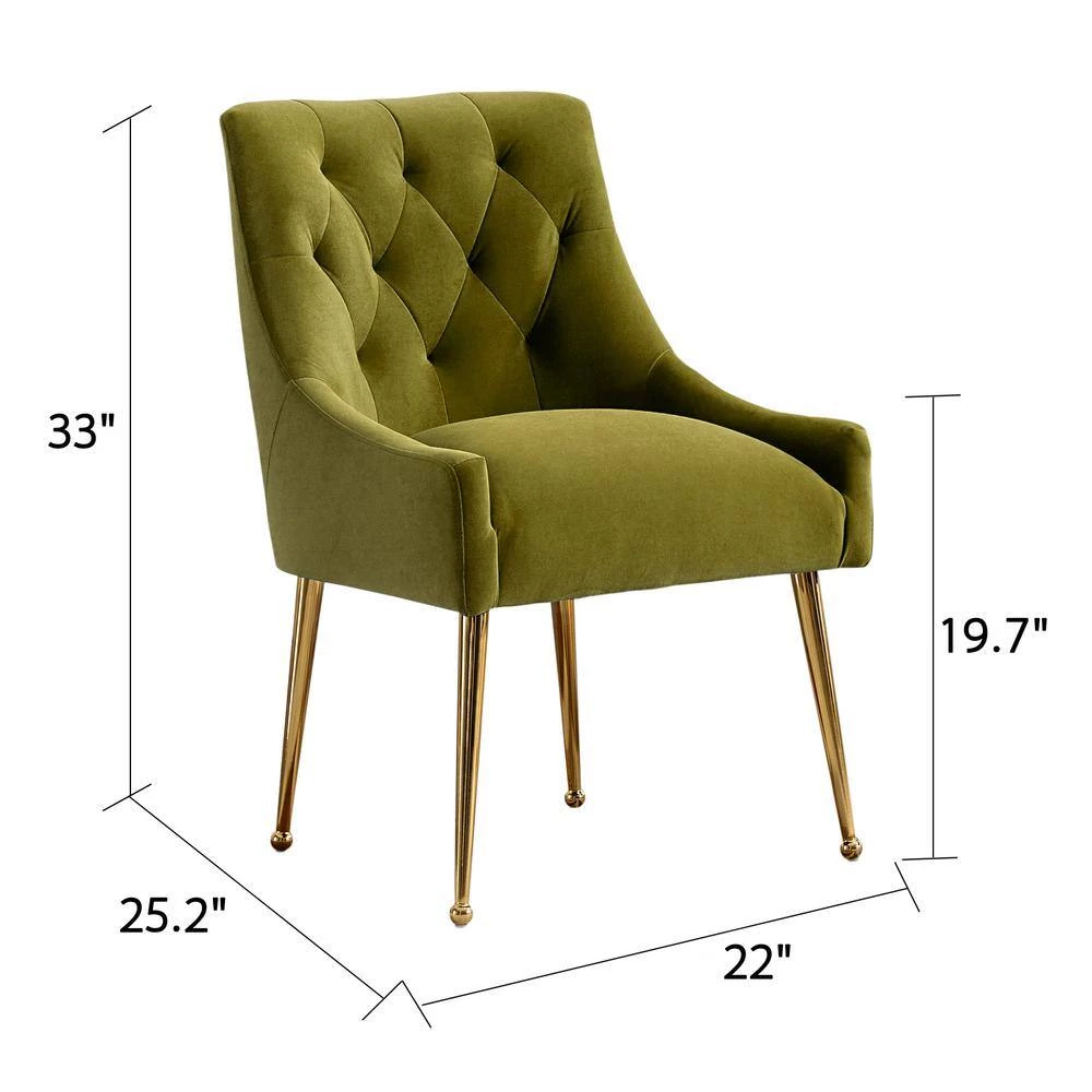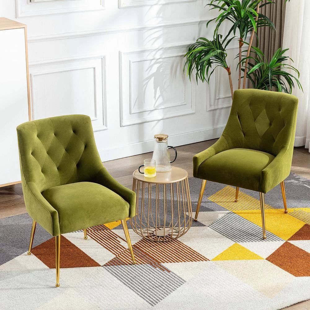 There are many beautiful design details on this dining chair (set of 2), The classic tufted design adds luxurious comfort to your dining experience. Whether your intention is to place it in your guest room for a splash of color and comfortable rest for weary visitors or to place it around the dining room table, this is a chair that exudes comfort and elegance. The adjustable polished golden metal legs bring modern design and add to the timeless fashion of this piece. Place 2-together to create a conversation area or pair with arm loveseat or sofa for a cohesive look.