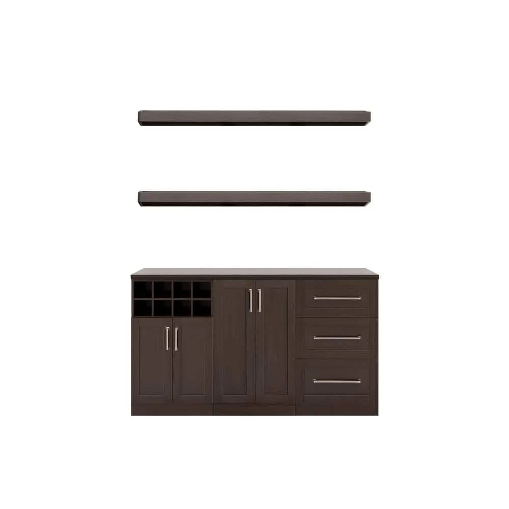 - Set includes: 1x espresso 21 in. 3-drawer cabinet, 2x espresso 63 in. display shelf, 1x espresso 21 in. bottle cabinet, 1x espresso 21 in. 2-door cabinet, 1x espresso 63 in. top