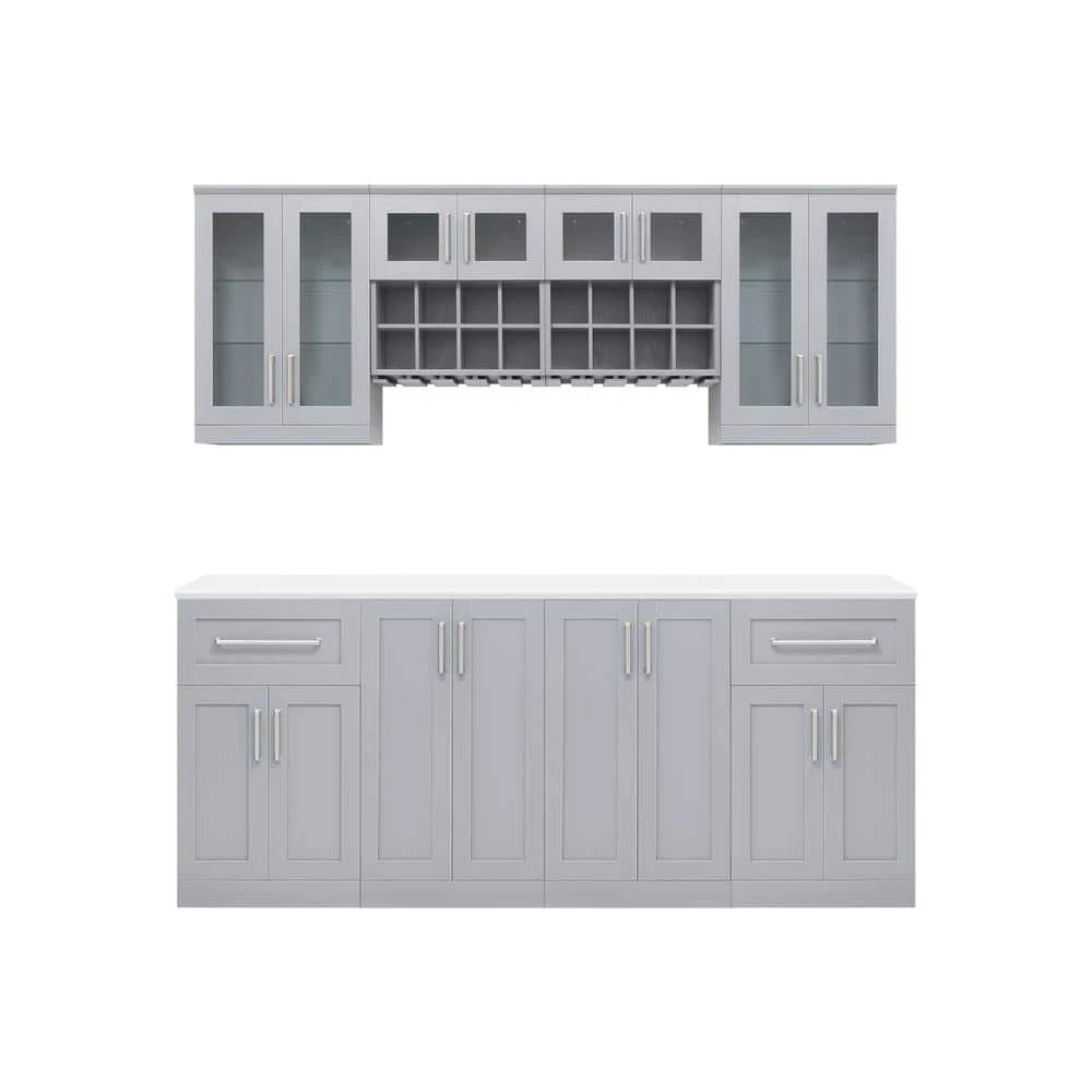 - Set includes: 2x gray 21 in. split cabinet, 2x gray 21 ft. wall rack, 2x gray 21 in. short wall, 1x white 84 in. top, 2x gray 21 in. 2-door cabinet