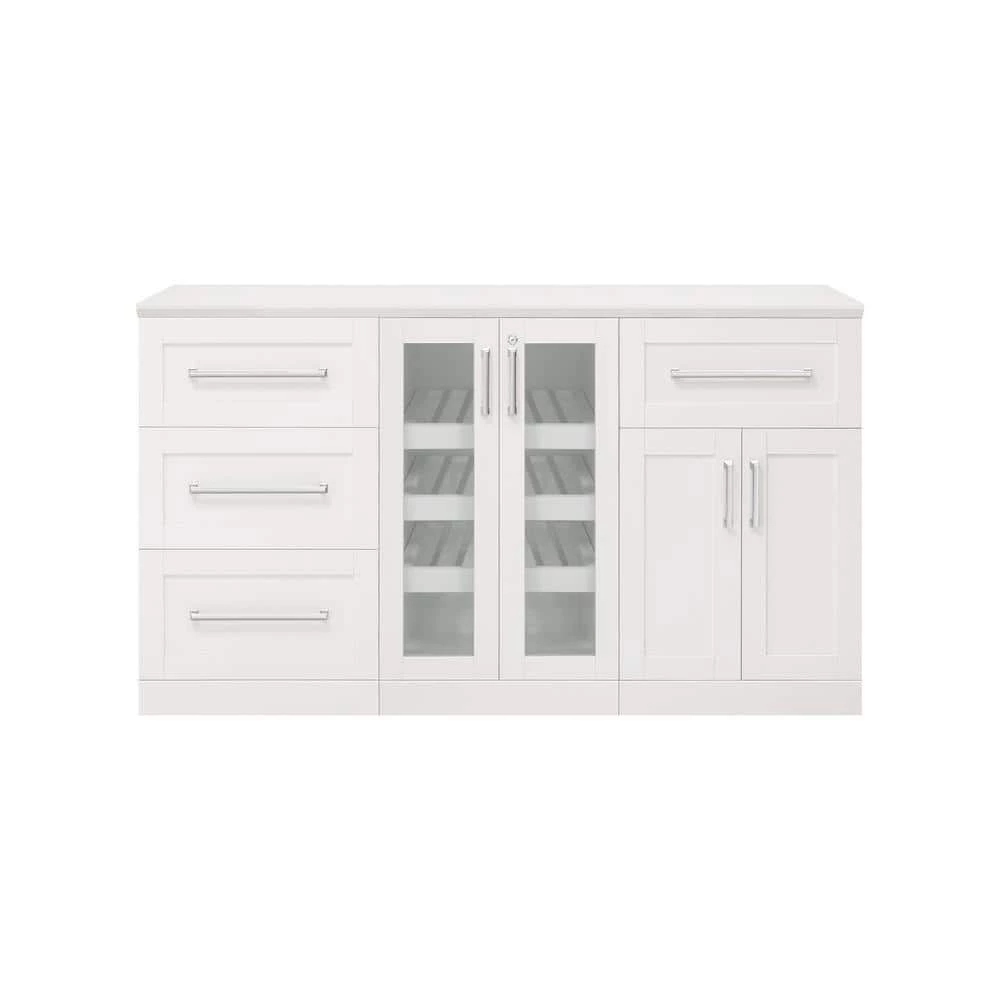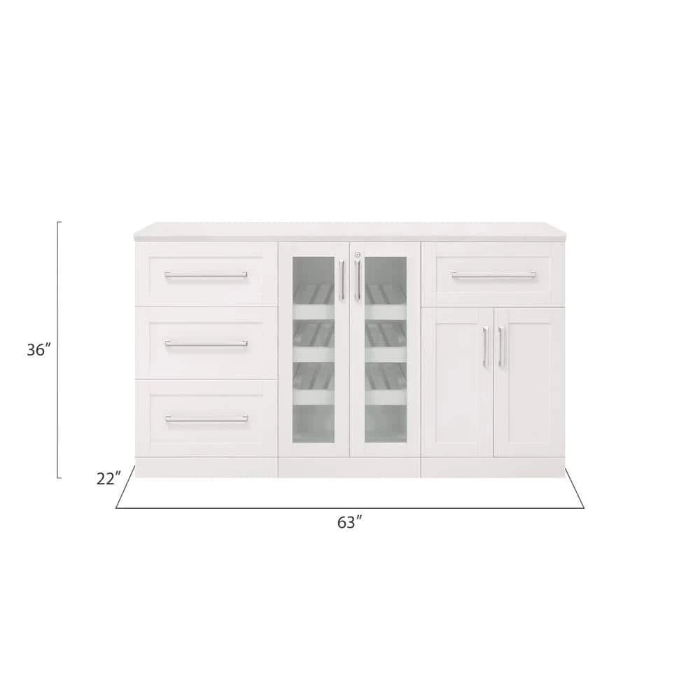 - Set includes: 1x white 21 in. display cabinet, 1x white 21 in., 3-drawer cabinet, 1x white 21 in. split cabinet, 1x white 63 in. top