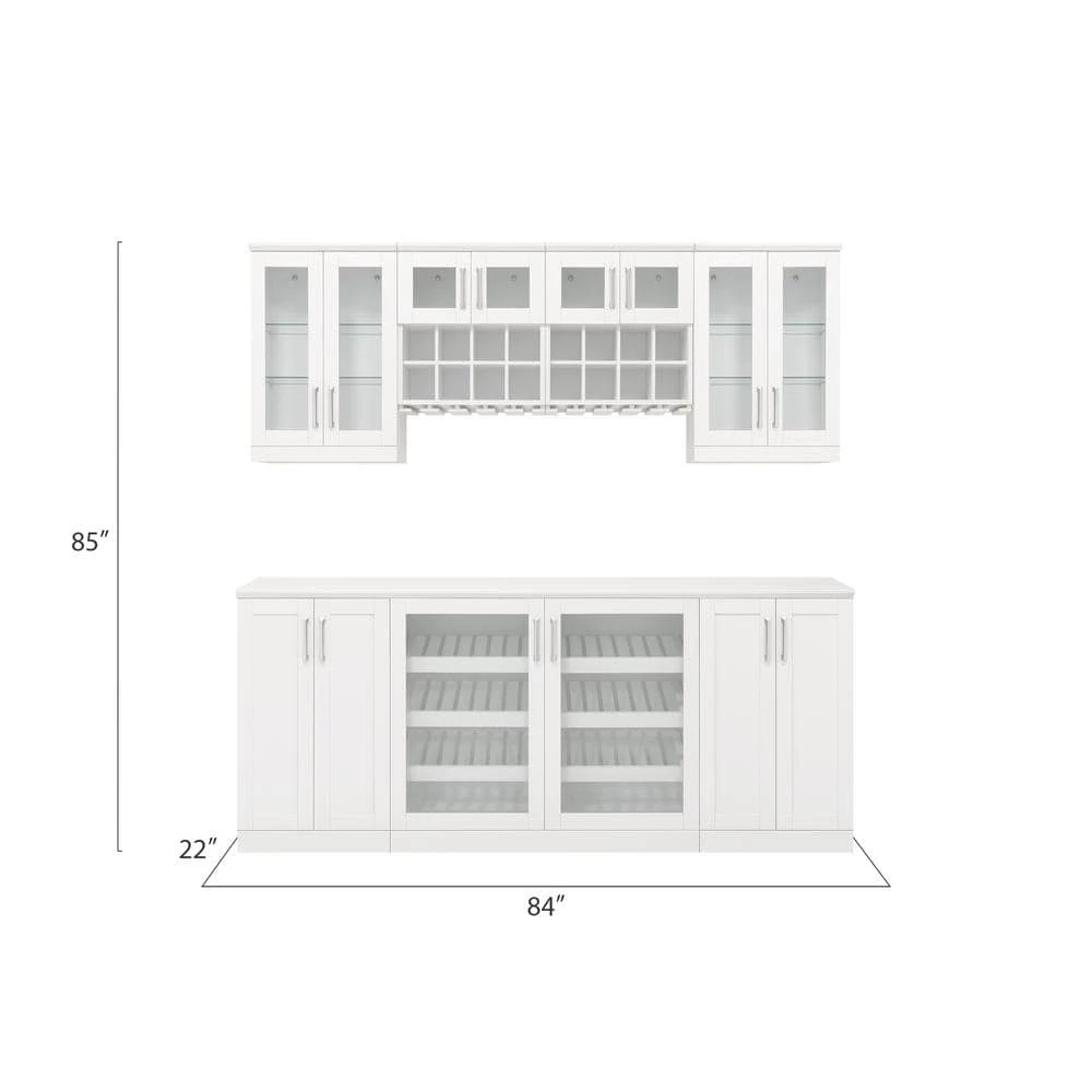 - Set includes: 1x 42 in. white double wide display cabinet, 2x white 21 in. wall rack, 2x white 21 in. short wall, 2x white 21 in. 2-door cabinet, 1x white 84 in. top