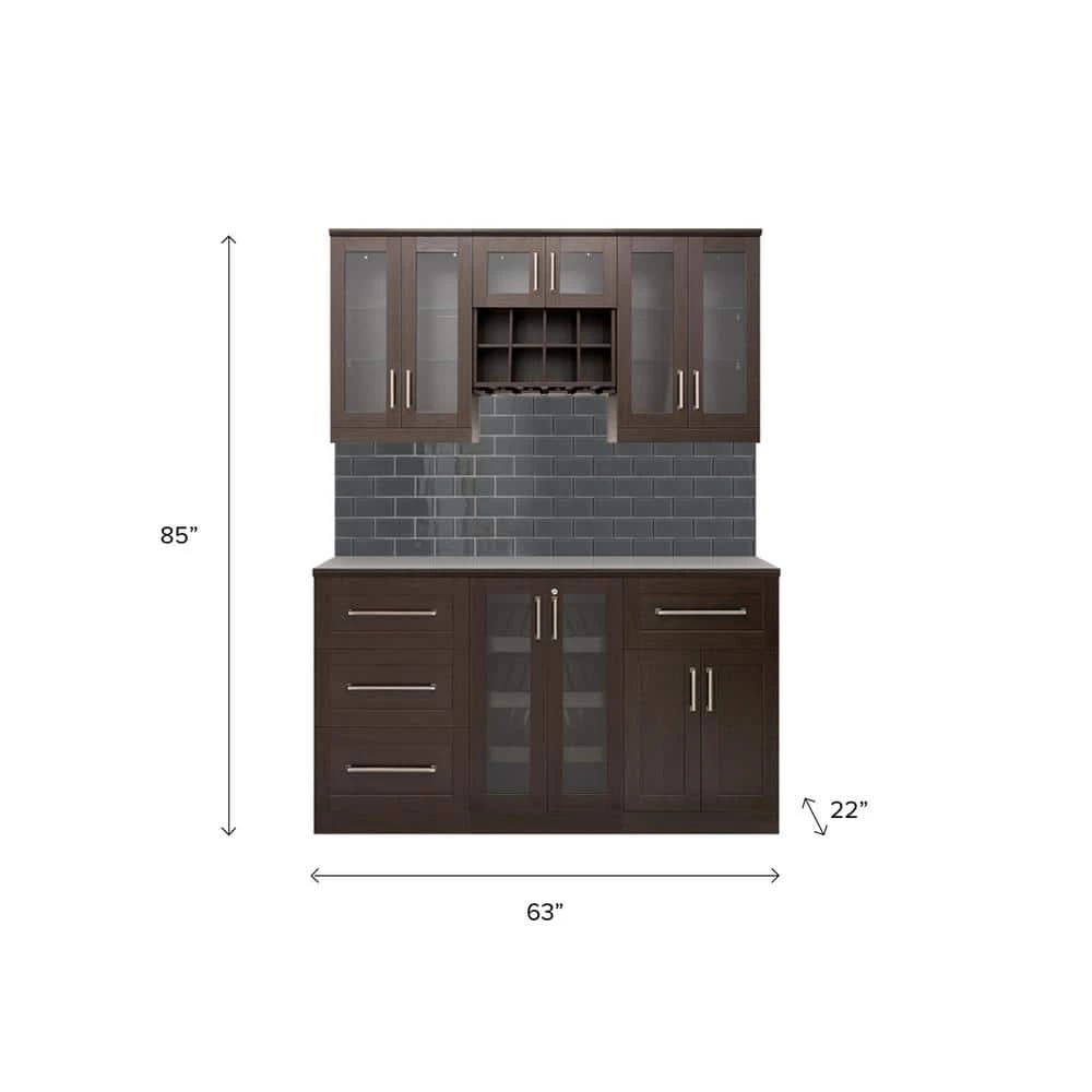 - Set includes: 1x 21 in. display cabinet, 1x 21 in. 3-drawer cabinet, split, 2x 21 in. short wall cabinet, 1x 21 in. wall wine rack, 1x 63 in. top, dark gray glass subway tile