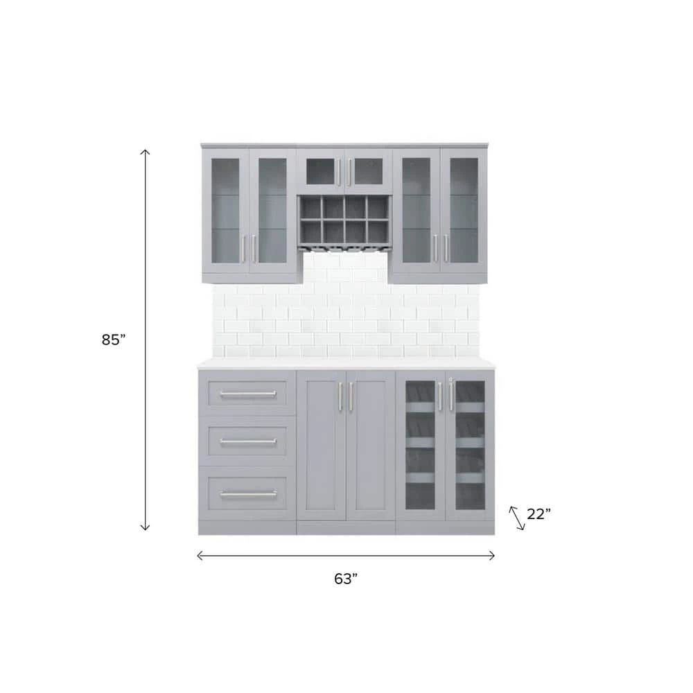 - Set includes: 1x 21 in. display cabinet, 1x 21 in. 2-door cabinet, 1x 21 in. 3-drawer cabinet, 2x 21 in. short wall cabinet, 1x 21 in. wall wine rack, 1x 63 in. top, super white glass subway tile