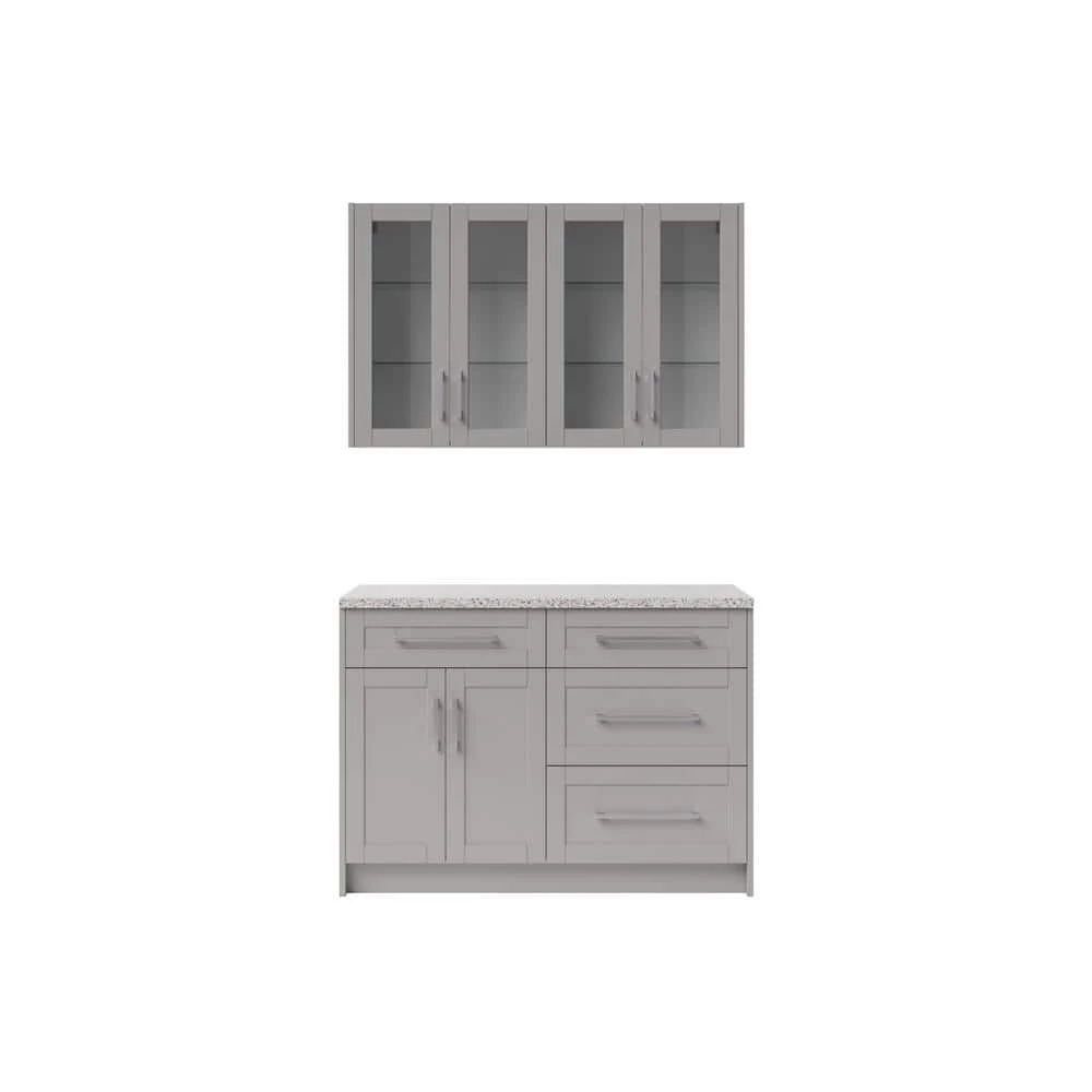 - Includes: 2x 24 in. gray two glass door wall cabinet, 1x 24 in. gray two door, single drawer cabinet, 1x 24 in. gray three drawer cabinet, 2x gray wall cabinet side panel, 2x gray base cabinet side panel, 1x 48 in. white pearl granite countertop extended, 6x contemporary small handle – brushed nickel, 4x contemporary large handle – brushed nickel, 1x door handle template, 1x drawer handle template, 1x 48 in. gray toe kick (small), 1x 48 in. cabinet hanger wall rail (small)