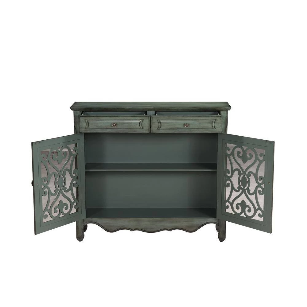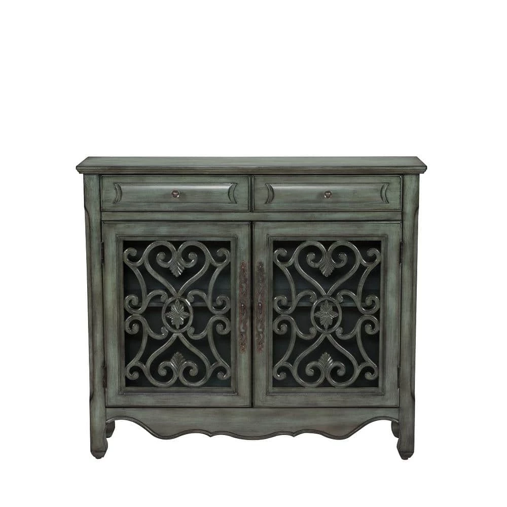 European flair and rustic accents make this two-drawer cupboard one-of-a-kind. Finished in a neutral Hood Green Grey, the architectural details are enhanced by the aged patina. The three doors are a work of sculptural art, in a graceful curved pattern. Glimpses of the interior shelves can be seen.