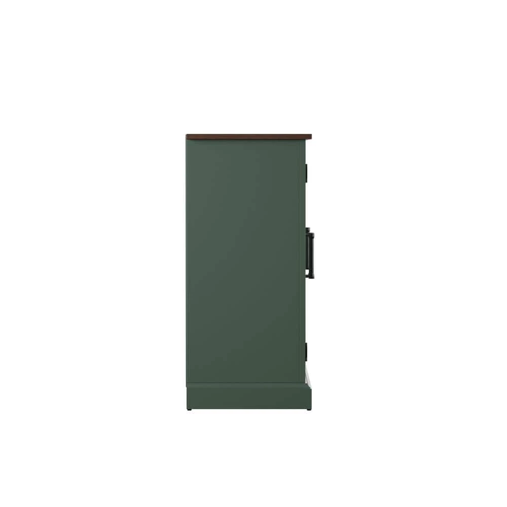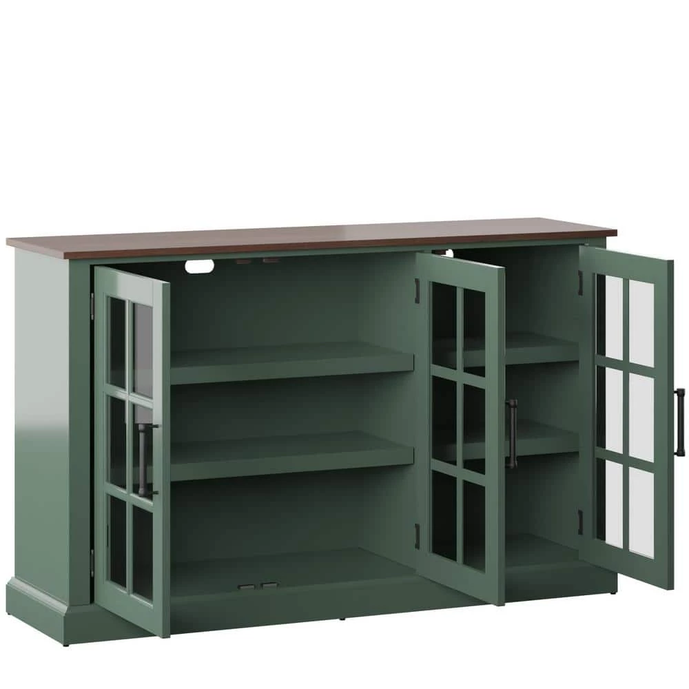 - 3-cabinet doors open up to reveal two separate storage areas with 1-adjustable shelf in each