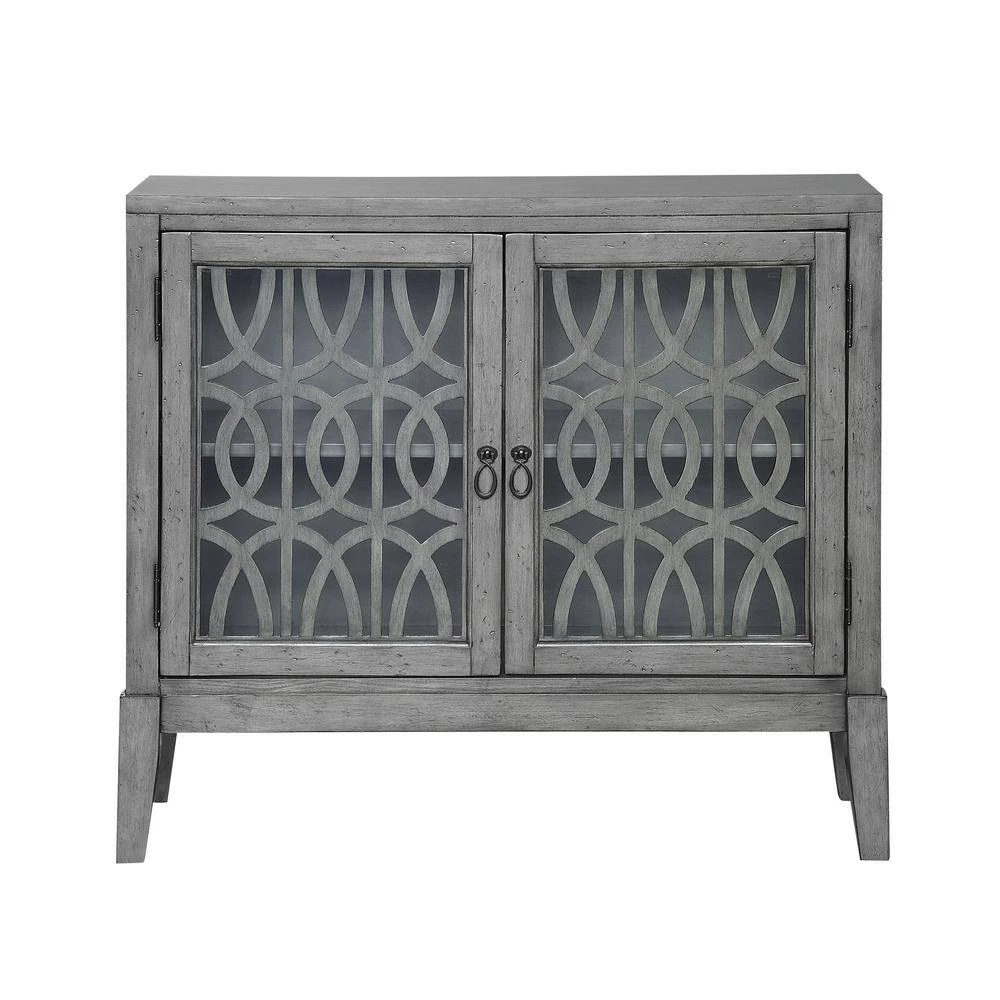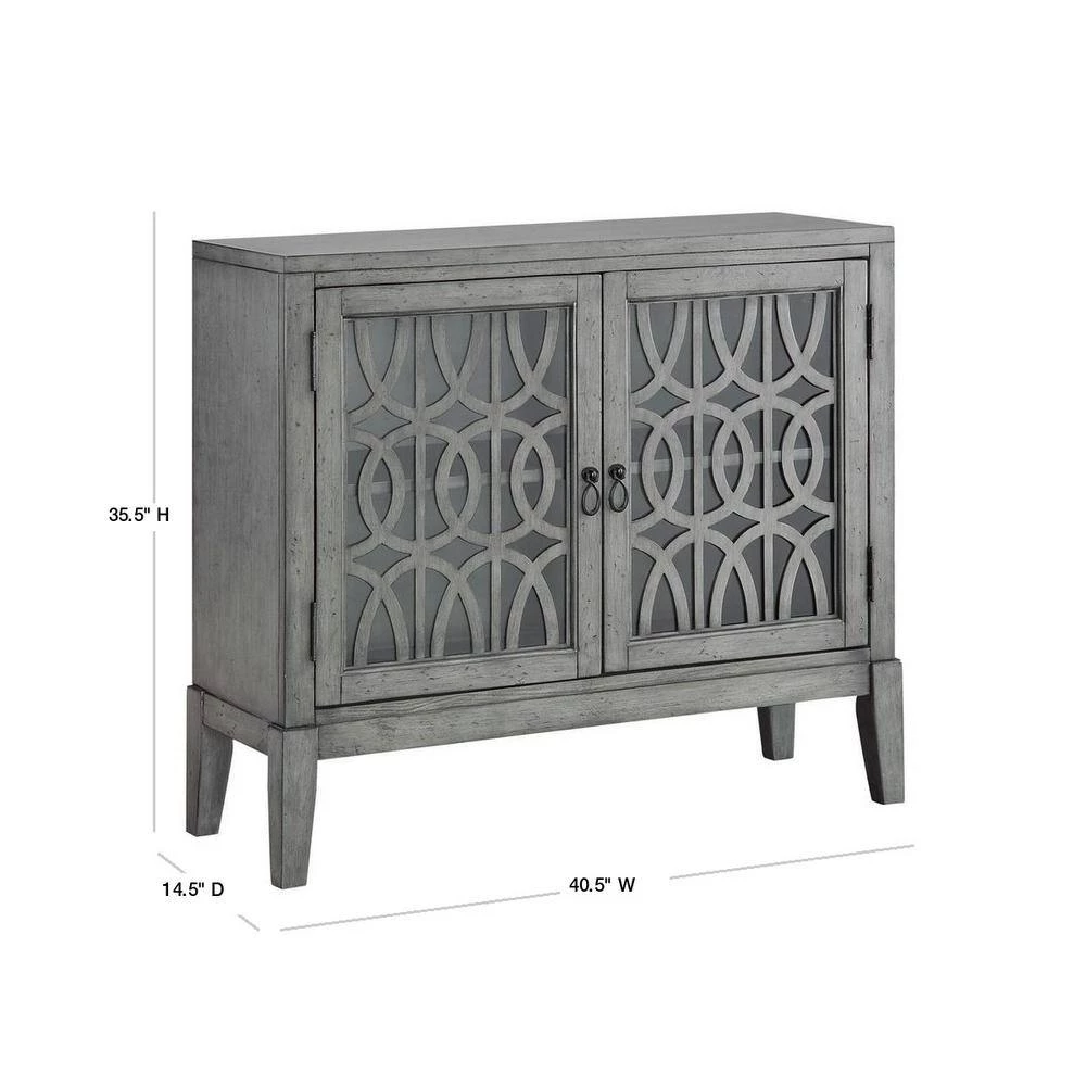 Simply elegant, this 2-door cabinet has a distressed soft grey finish. 4-tapered legs support a slightly offset base for added interest. The clean lines of the frame are balanced beautifully by a flowing geometric lattice design on each glass door. An interior shelf maximizes storage and single-twist ring pulls complete the look.