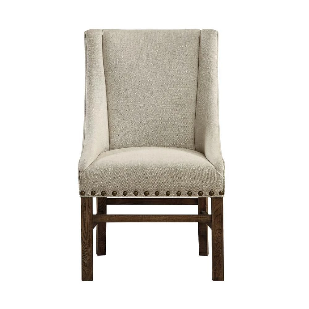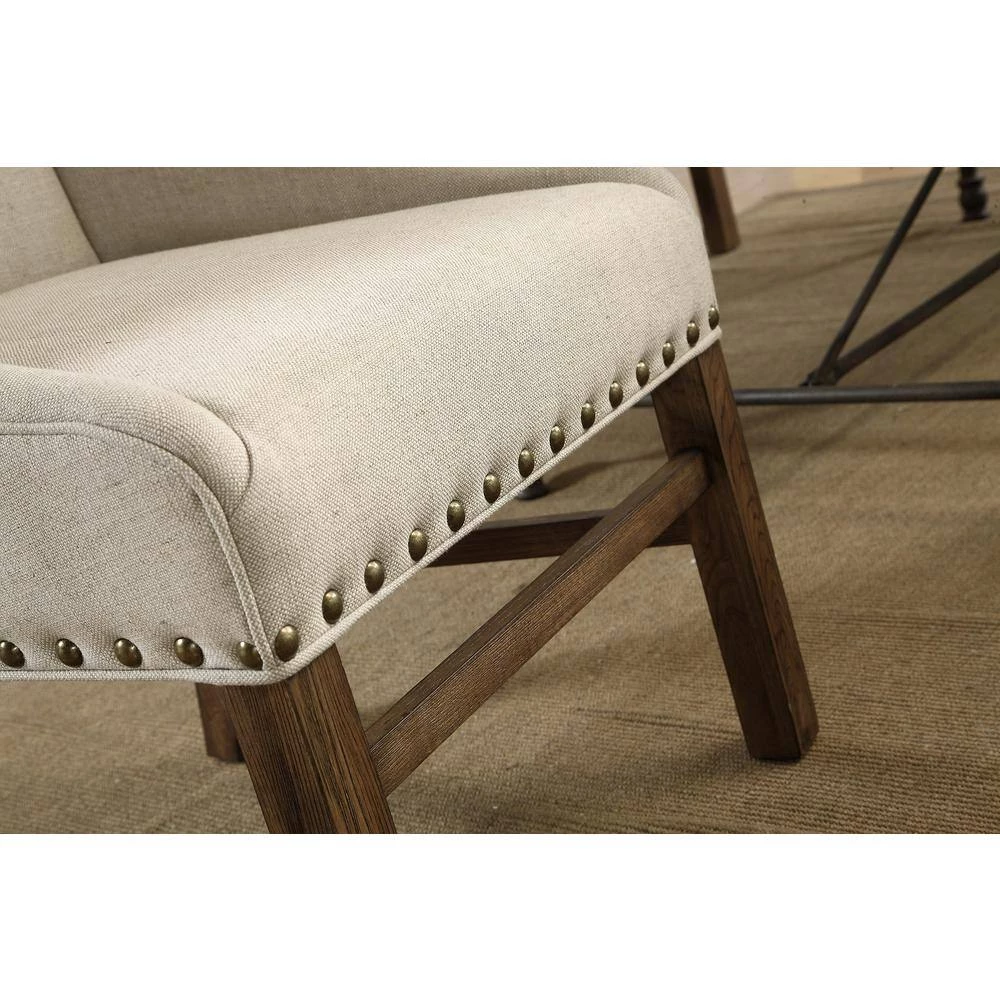 For your desk, around your dining table, or with your vanity, our accent chair has the details you will love. Expertly upholstered in a natural single welt trim and with low curved sides that were built for comfort. Wooden legs and crossbars are stained in a warm medium brown chatter finish which emphasizes the antiqued brass nailhead trim that encircles the lower edges. A timeless look.
