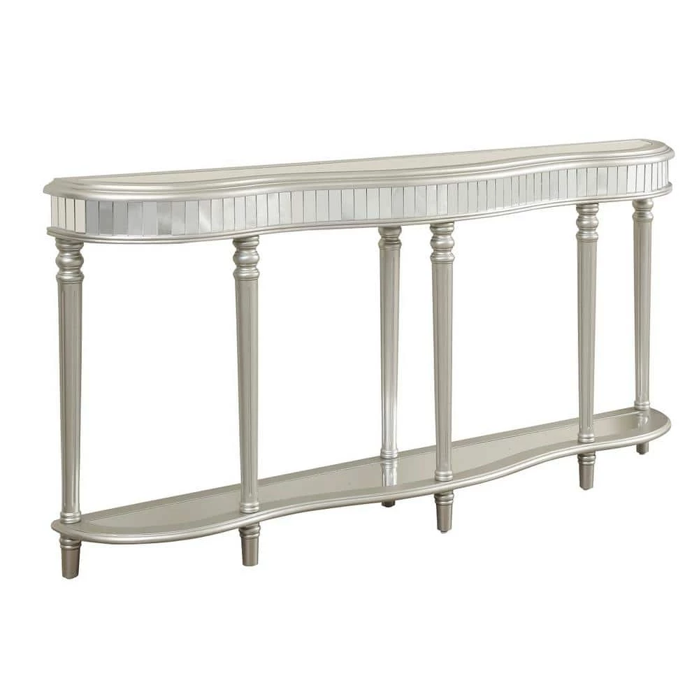 This Razzle Dazzle Metallic finished console table adds sparkle and shine to your entry. This gently curved console table features tiled mirrored apron, shaped beveled mirrored top and lower shelf along with six turned and fluted legs. A glamorous stage for vases, canvas prints and framed photos, this console table provides a glamorous touch to any room in your home.