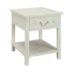 A fresh Reeds White coats this Chairside Chest, but still allows the grains of the wood to peek through for a subtle tone-on-tone appeal. Oversized silver tone drop ring hardware adorns the 3-drawers, adding just the right touch of metallic shine for a stunning look. Perfect with a silver lamp next to your favorite chair, but also just right for holding hand towels, oils and lotions in that new guest bat.