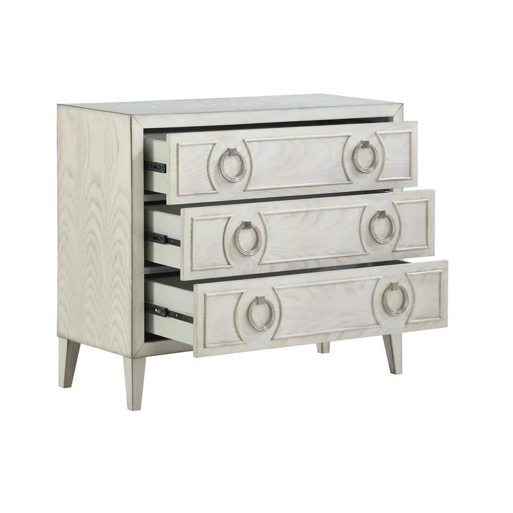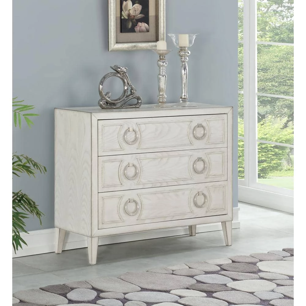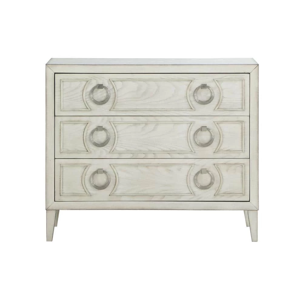 The Reeds White finish on this Chest will blend with any decor and do so in style. This piece has an elegant contemporary style. With a classic squared frame, tapered legs and three deep drawers, all of which are adorned with oversized drop ring hardware and molded detailing, this beautiful chest provides not only that extra storage you need, but also gives you an ideal display area for your favorite photos, lamps or a vase of fresh cut flowers.