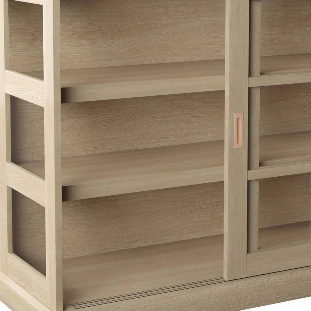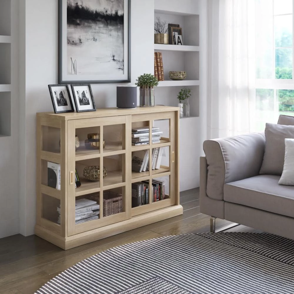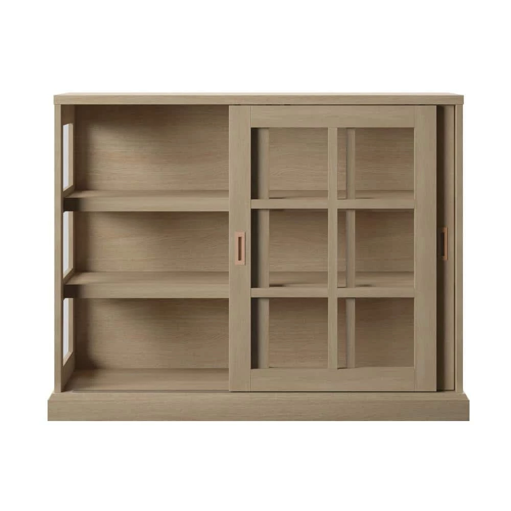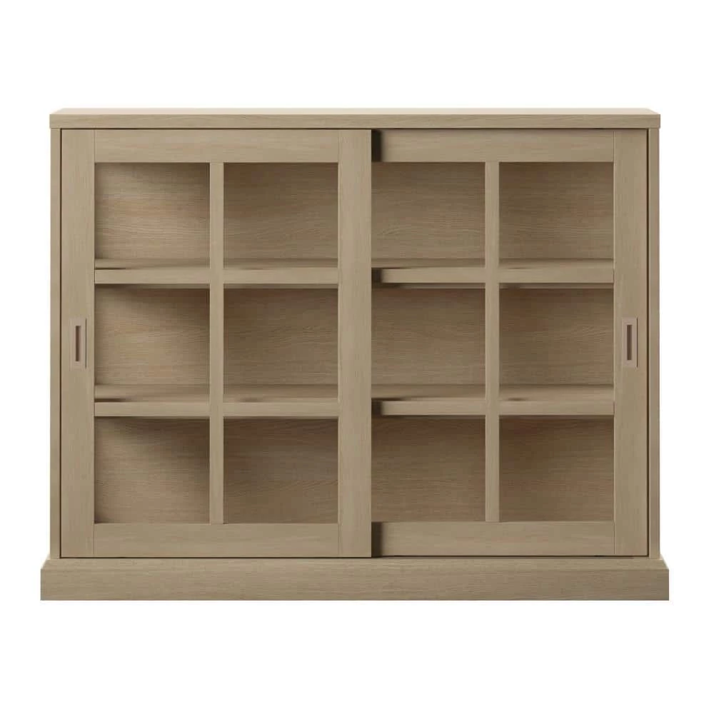 Place this multifunctional piece anywhere in your home to show off family photos, collector’s items, prized china, and more. Sliding glass doors feature window-pane mullions over tempered glass and contrasting inset handle hardware. The glass doors reveal the look of a finished wood grain interior for modern farmhouse design with a touch of contemporary style.