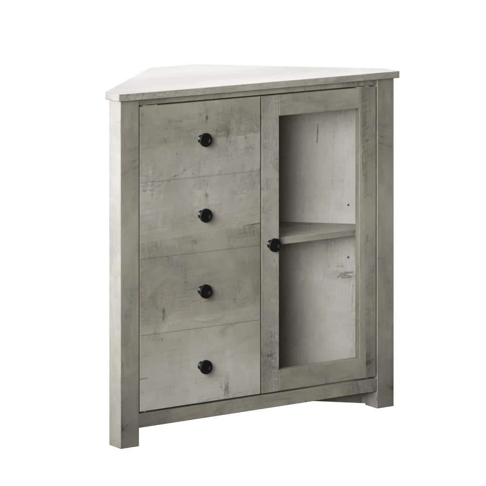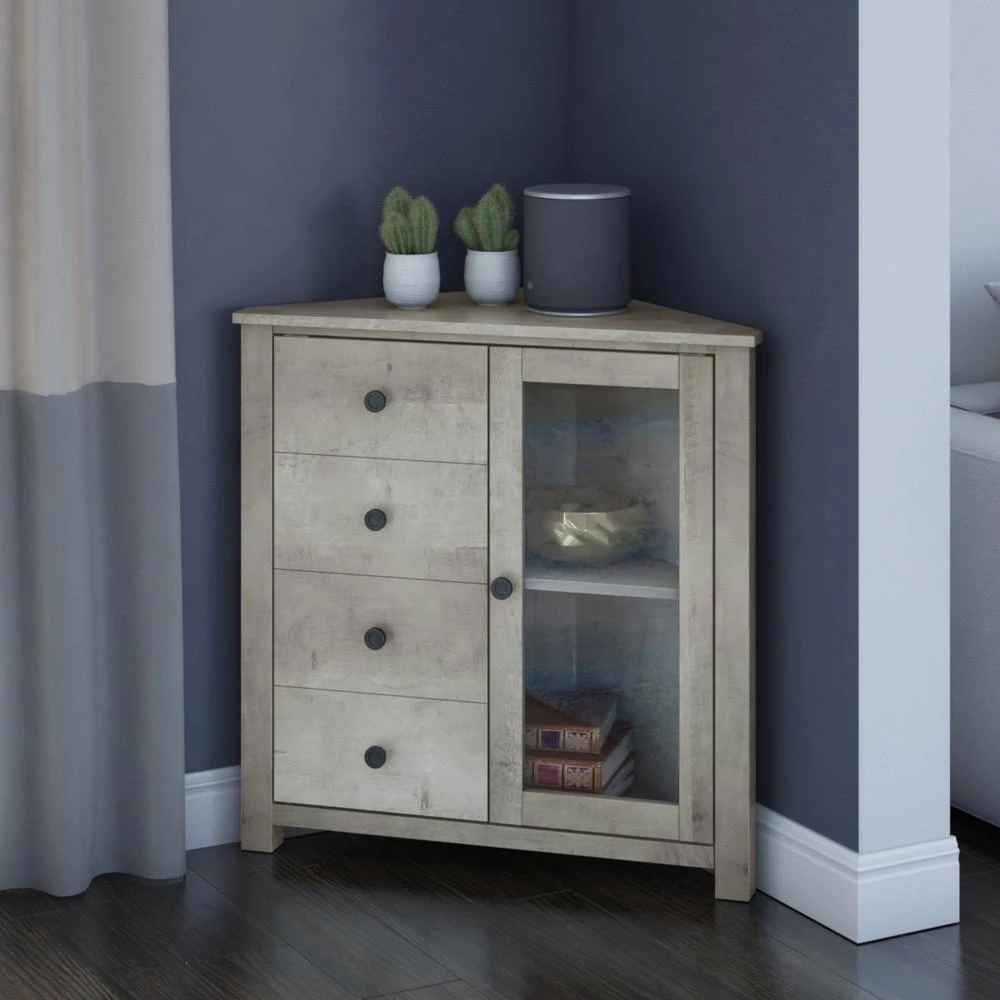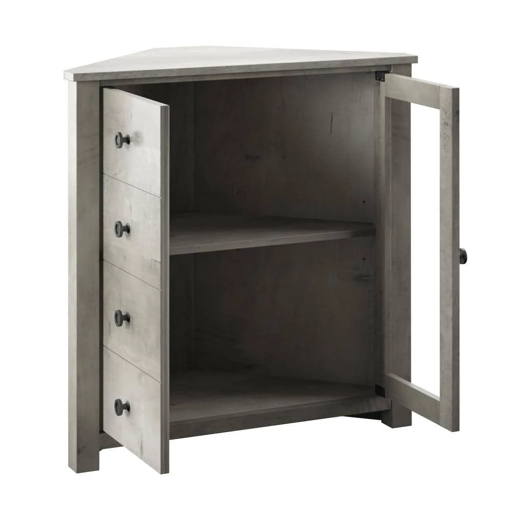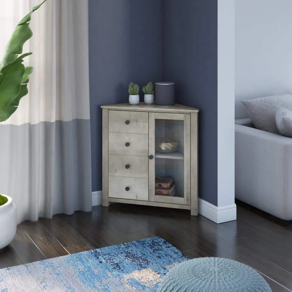 Get beautiful, traditional style and the extra storage you want all in one space-saving solution with this corner accent cabinet. The double door cabinet features a glass-paned door on one side and a faux drawer design on the other. Behind the cabinet doors, one interior shelf can be adjusted to three different height levels to meet your storage needs. Use this accent cabinet anywhere in your home, from the living room to the bathroom and everywhere in between. Just the right size for items like small plates and vases or toiletries and hand towels, this accent cabinet is a perfect fit for any room.