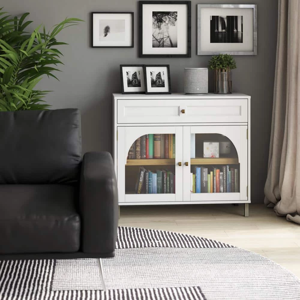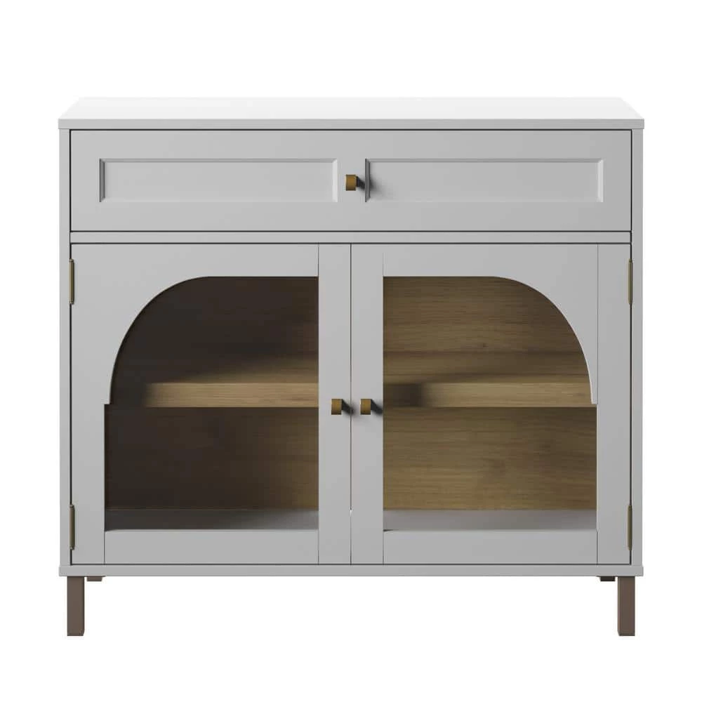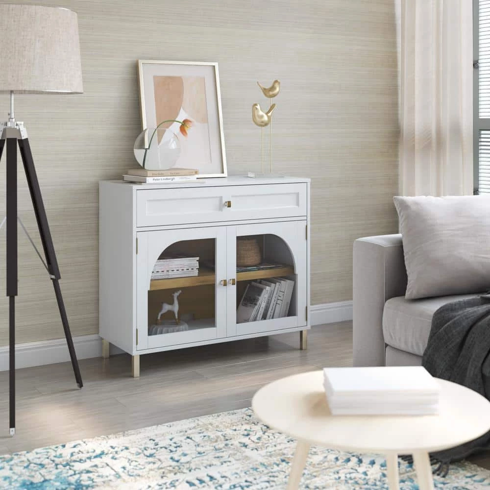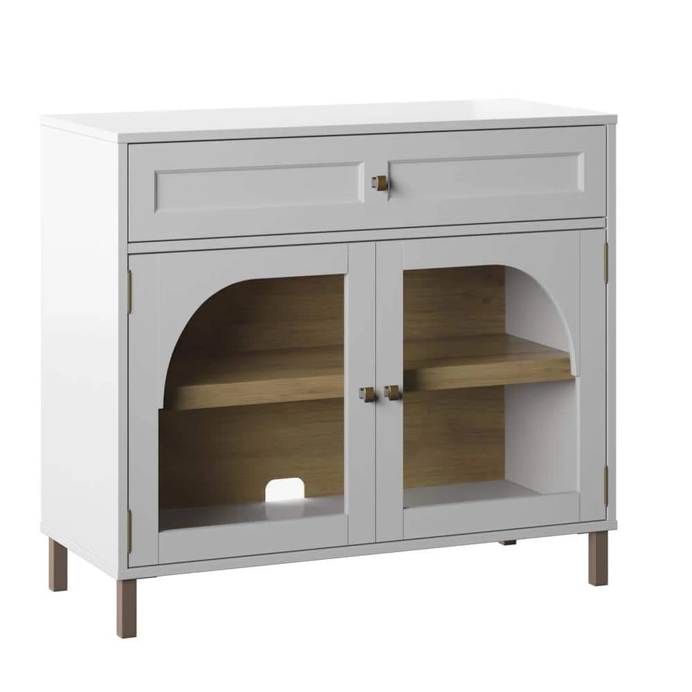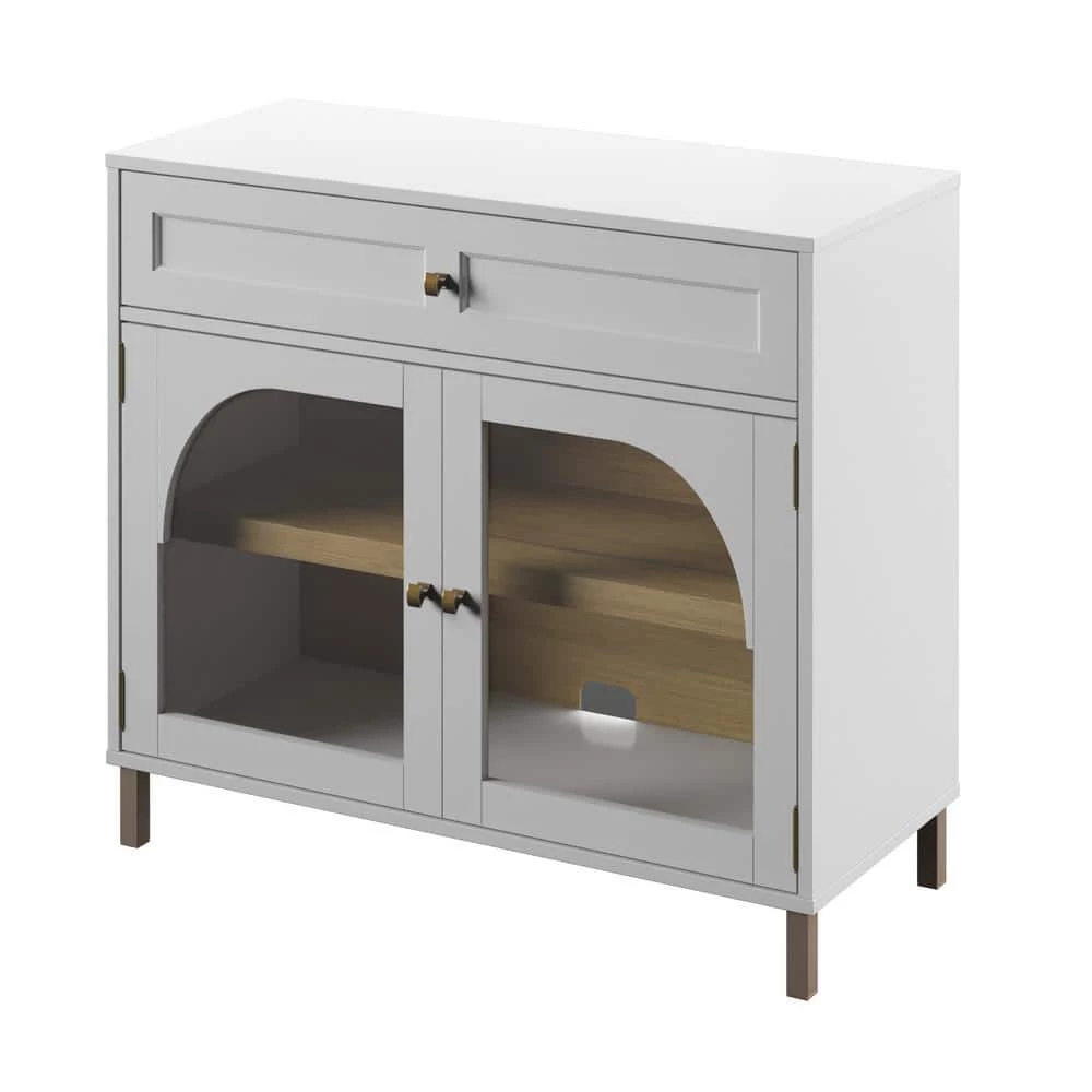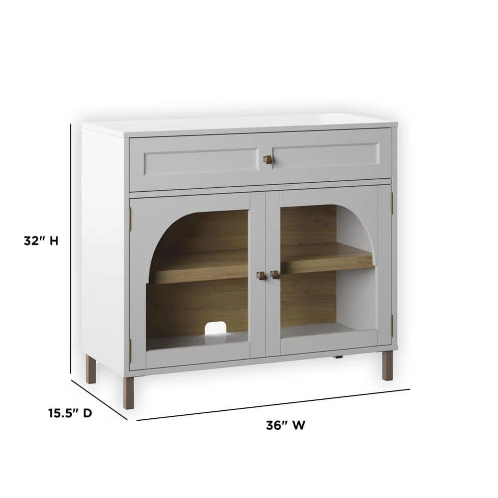 - Accent cabinet features 2-glass doors and metal barrel hinges for modern design flair